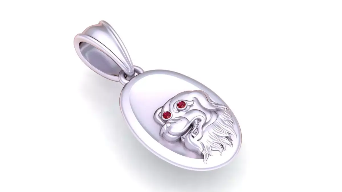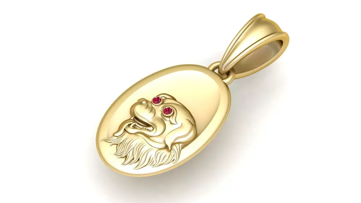 This is an elegant oval-shaped gold pendant featuring a finely detailed embossed dog head motif. The dog’s expressive eyes are set with two brilliant red gemstones, adding a touch of vibrance and luxury. The intricate fur texture around the neck flows gracefully, giving the piece a lifelike and artistic appeal. The smooth, polished gold background enhances the relief work, while the wide, sculpted bail ensures durability and style. This pendant beautifully blends craftsmanship, symbolism, and elegance, making it ideal for both personal wear and gifting.