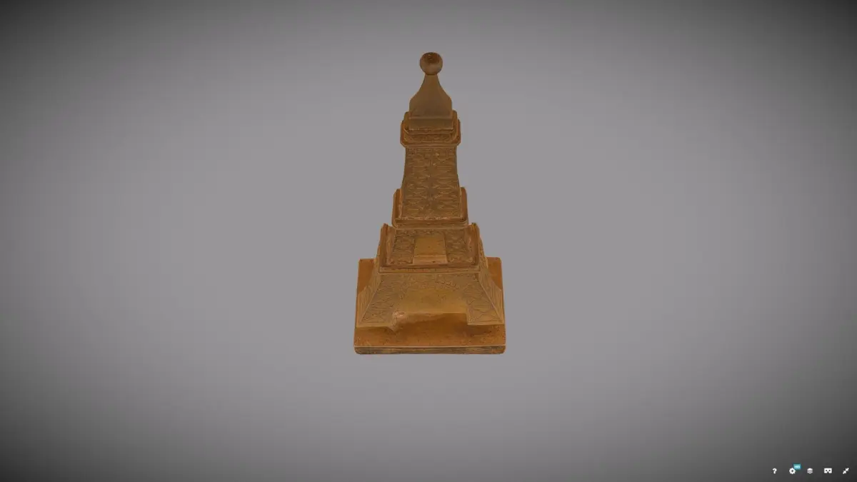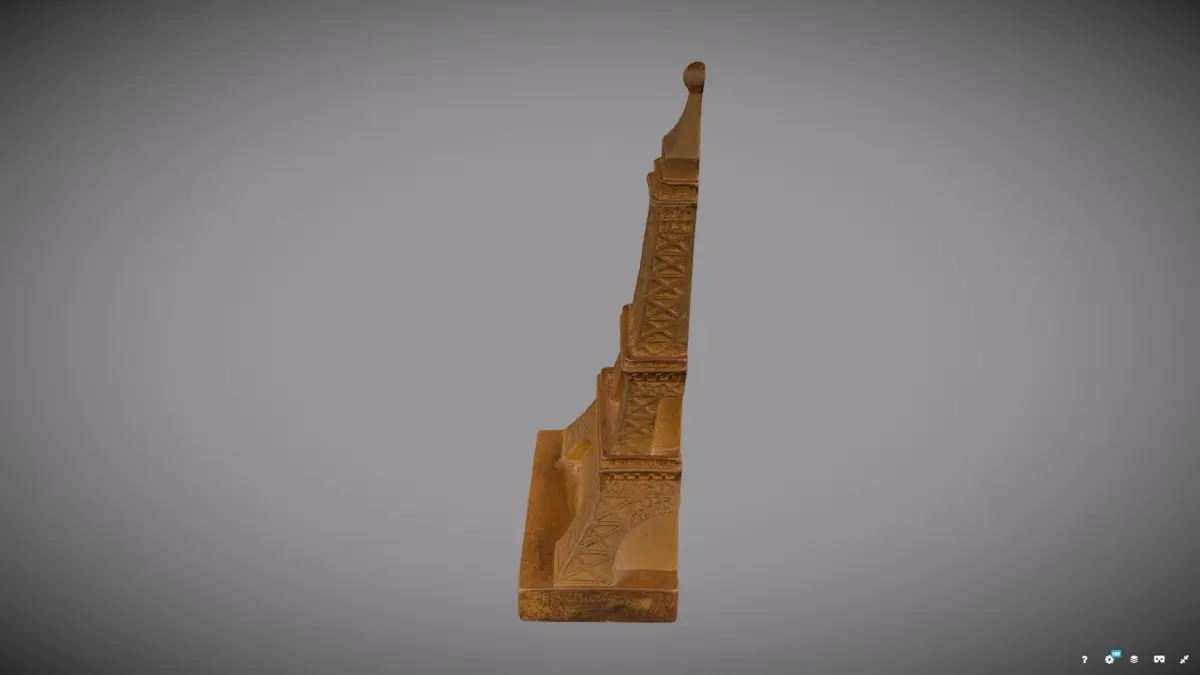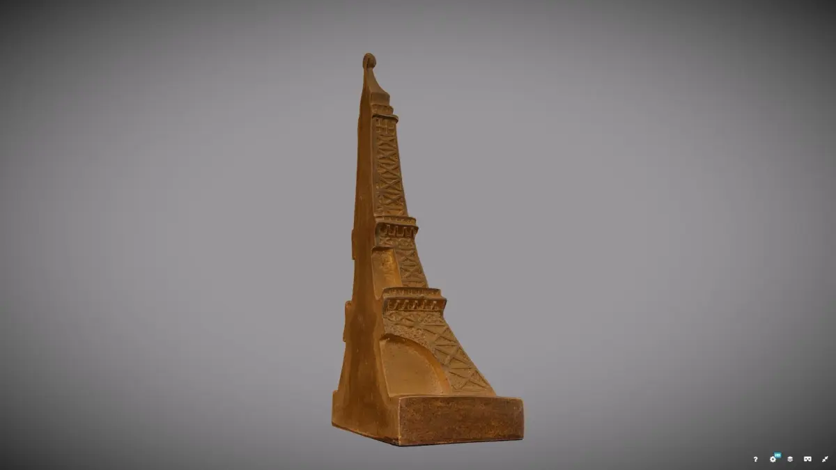 Photo-real, unlit, texturized model of a Gold Eiffel Tower Bookend. This object was generated using photogrammetry with a DSLR camera and images edited in Light Room, compiled in Reality Capture, and re-topologized in Insta-Mesh. The mesh is edited in Agisoft, and model retextured in Reality Capture.
