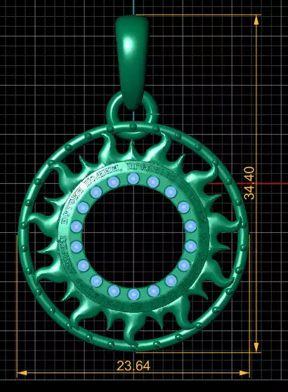 A striking gold pendant featuring a bold circular design with flame-like cutouts radiating from the center. The inner ring is embellished with a continuous row of sparkling gemstones and engraved with intricate text, giving the piece a unique, symbolic character.