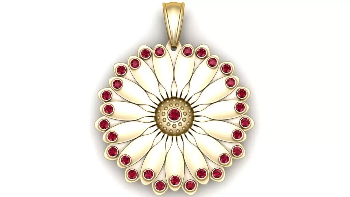 This stunning gold pendant is designed in the form of a blooming flower, radiating elegance and charm. Each petal is meticulously shaped with a smooth polished surface, and the tip of every petal is adorned with a brilliant red gemstone, creating a striking contrast against the gold. The center of the flower features a textured gold disc with a larger red gemstone, enhancing the pendant’s focal point and adding depth to the design. Perfect for adding a touch of nature-inspired luxury to any look.