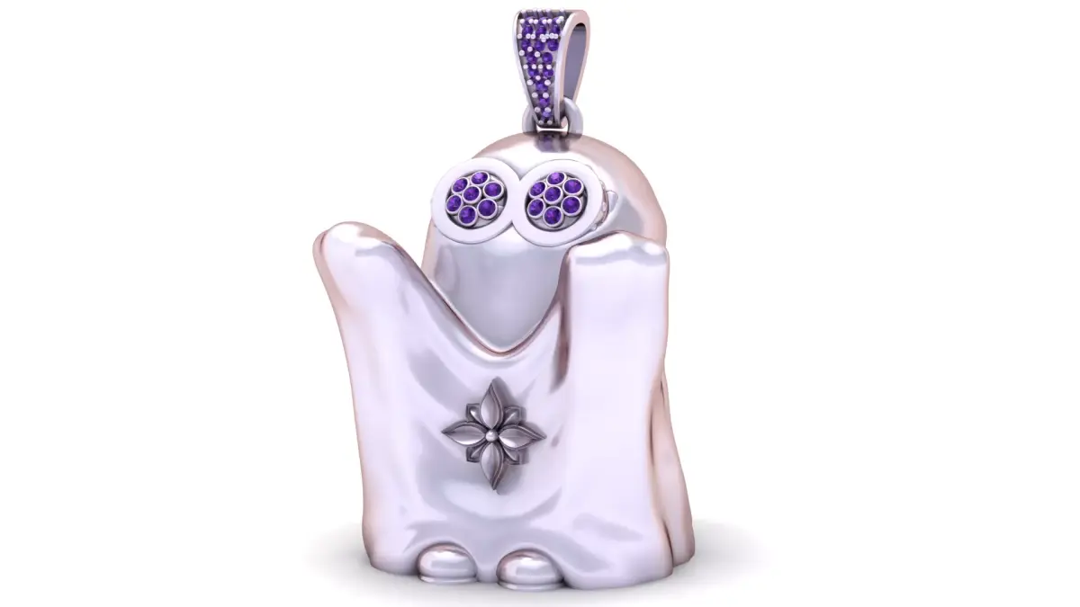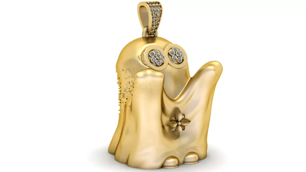 This adorable gold ghost pendant features a cute, playful design with sparkling diamond eyes and a charming flower-shaped accent on the body. The smooth, shiny gold finish adds elegance to the playful ghost figure, making it an ideal accessory for Halloween or year
