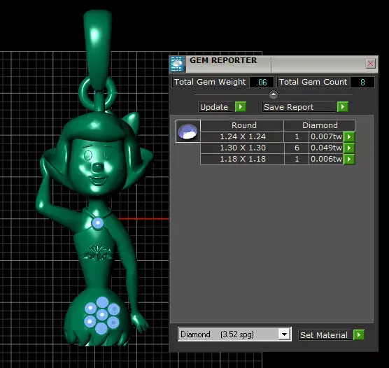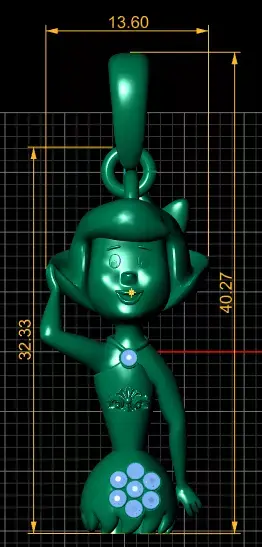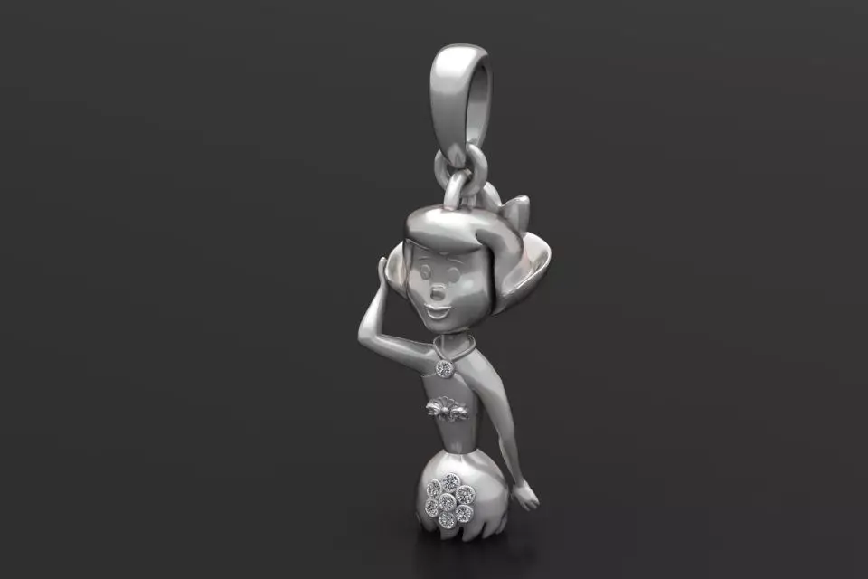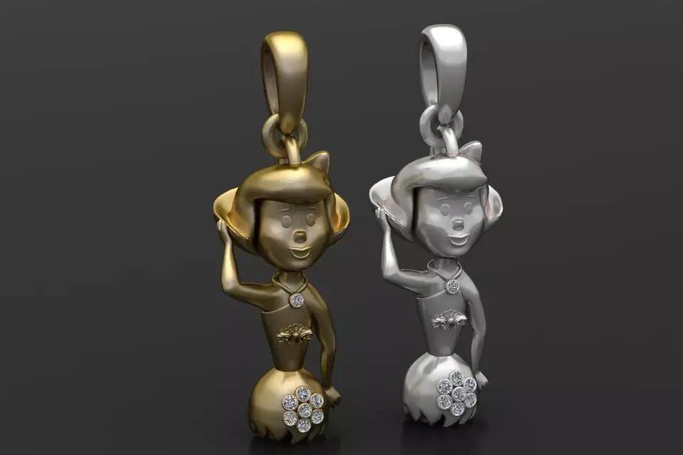 This charming 3D model features a gold pendant designed in the form of a playful cartoon-style girl wearing a hat. The figure is delicately detailed, with engraved facial features, a flower accent on the chest, and a larger diamond-studded floral design at the skirt. A single diamond is also set at the neckline, adding sparkle and elegance. The polished gold finish gives the pendant a luxurious yet whimsical appeal, making it ideal for both collectors and fashion-forward jewelry lovers.
