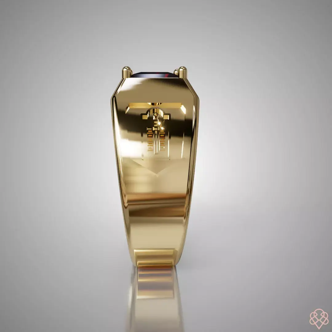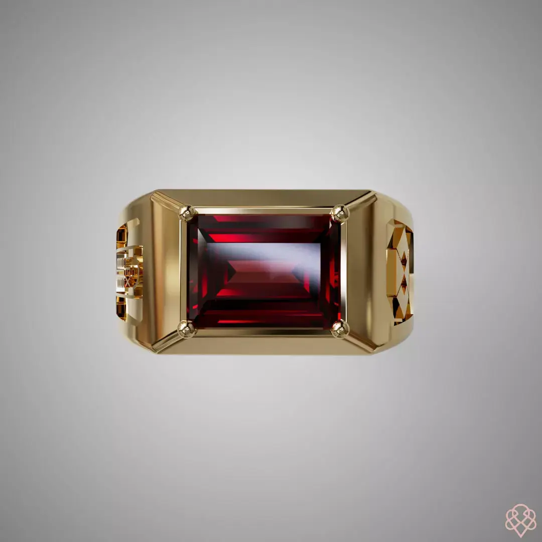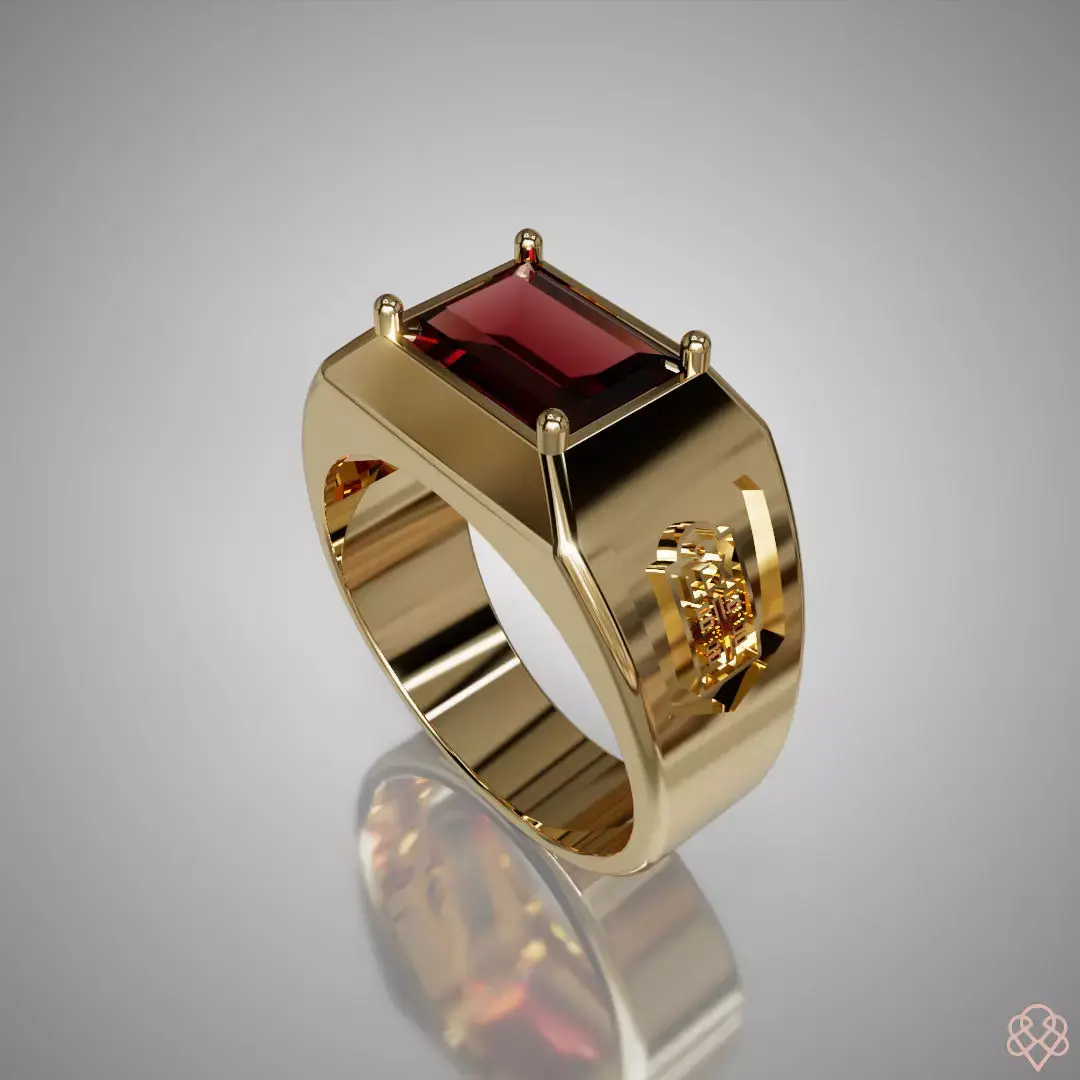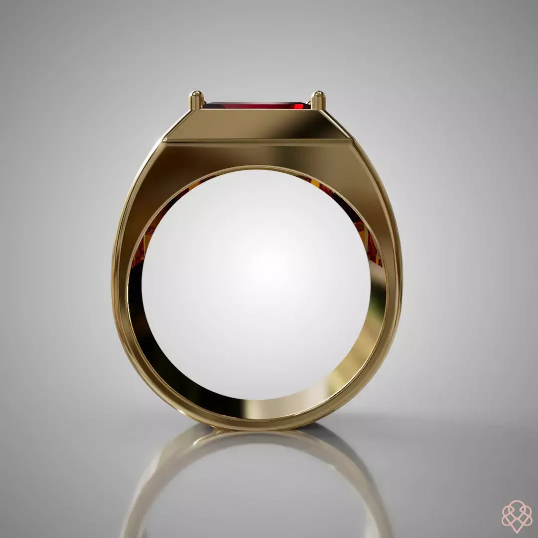 High-quality 3D model of a bold gold graduation ring featuring a rectangular-cut red gemstone in a raised four-prong setting. The design includes a solid, wide band with side engravings, offering a classic and timeless style. Perfect for academic, commemorative, or signet-style jewelry. Ready for professional 3D printing and fine jewelry manufacturing.