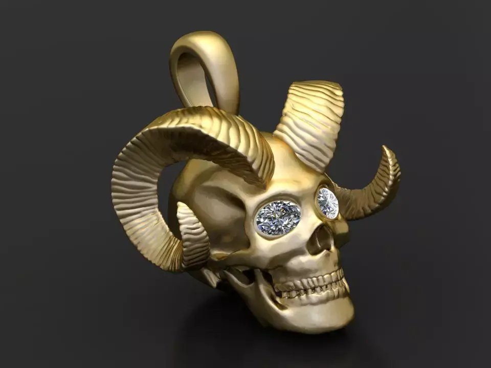 This captivating gold pendant features a detailed horned skull design, merging gothic style with fine craftsmanship. The curved, textured horns add dramatic flair, while the eyes are set with dazzling gemstones, giving the piece a piercing, otherworldly gaze. Perfect for those drawn to bold, edgy aesthetics, this pendant is a striking symbol of strength and defiance.