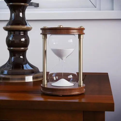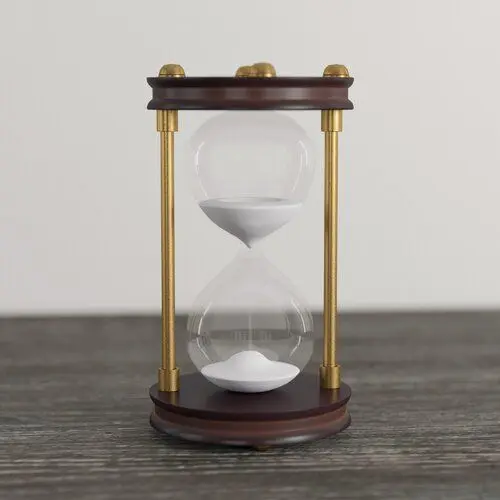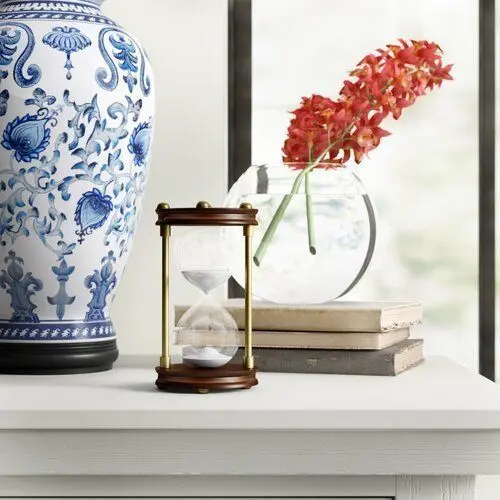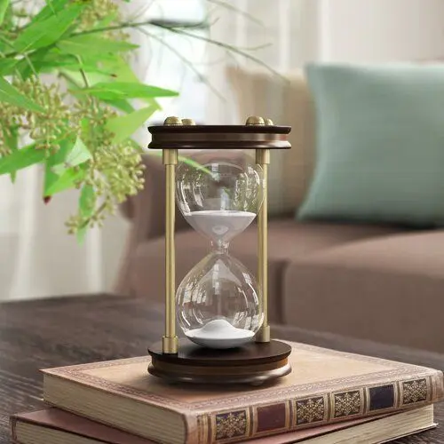 - Isn’t it about time you fill in that empty spot in your tabletop ensemble with an eye-catching focal point? This hourglass is the perfect pick! It's crafted from an iron and pine frame that's awash in classic hues of brown and gold. It features a circular base and top, while the iconic centerpiece is crafted from clear glass with white sand inside.