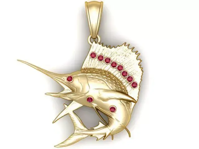 This gold marlin (swordfish) pendant is a striking tribute to the majesty of the ocean. Sculpted with incredible detail, the marlin leaps dynamically, showcasing its elongated bill and wide dorsal fin. The fin and body are beautifully accented with red gemstones, enhancing the sense of movement and elegance.