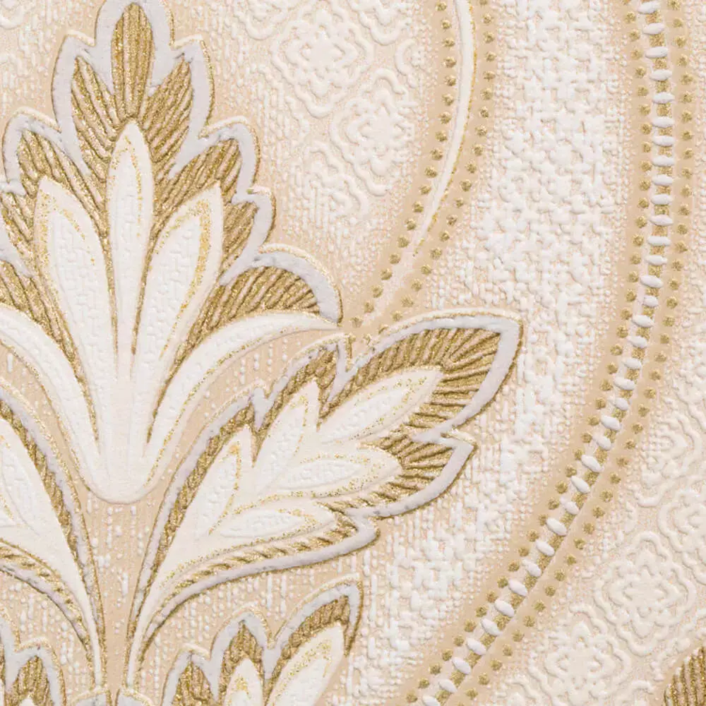 What’s includedSeamless wallpaper featuring repeating gold‑accent medallions with floral inlays on a warm ivory base for sophisticated living and hospitality spaces.