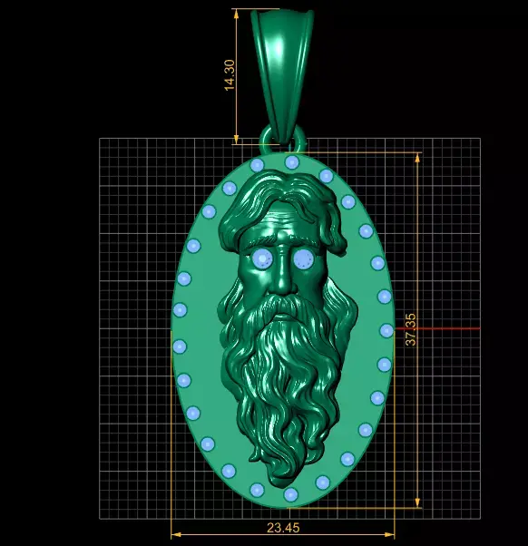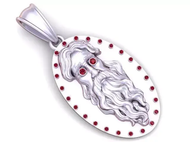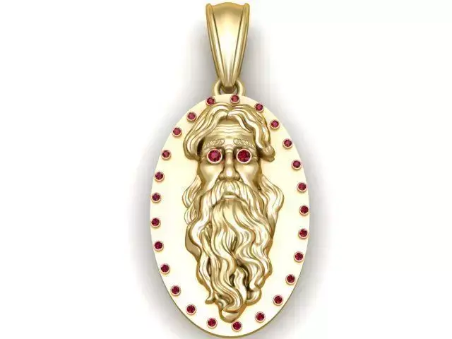 This remarkable pendant presents a regal oval medallion design crafted in radiant yellow gold. At its center, a finely detailed ancient bearded face emerges in high relief, symbolizing wisdom, authority, and timeless power. The expressive eyes are set with deep red gemstones, adding intensity and mystique to the design. Surrounding the medallion, a delicate border of red stones enhances its majesty and provides a luxurious frame. Combining historical artistry with modern craftsmanship, this pendant is a statement piece for collectors and admirers of symbolic jewelry.