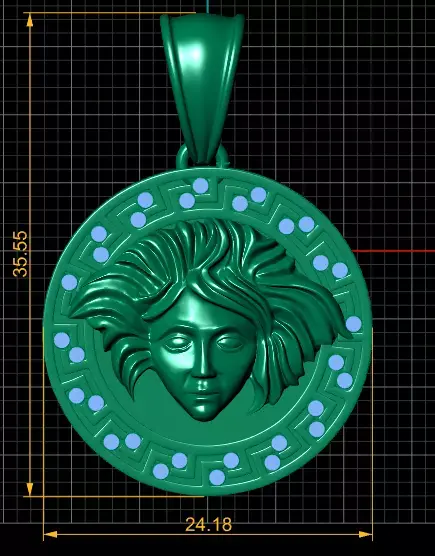 This luxurious gold medallion pendant features a beautifully sculpted face framed by flowing, detailed hair. Surrounded by an intricate geometric border, the piece is accented with perfectly set gemstones that add a brilliant sparkle to its regal design. A harmonious blend of classical artistry and modern elegance, it stands as a bold statement piece for those who appreciate fine craftsmanship and timeless style.