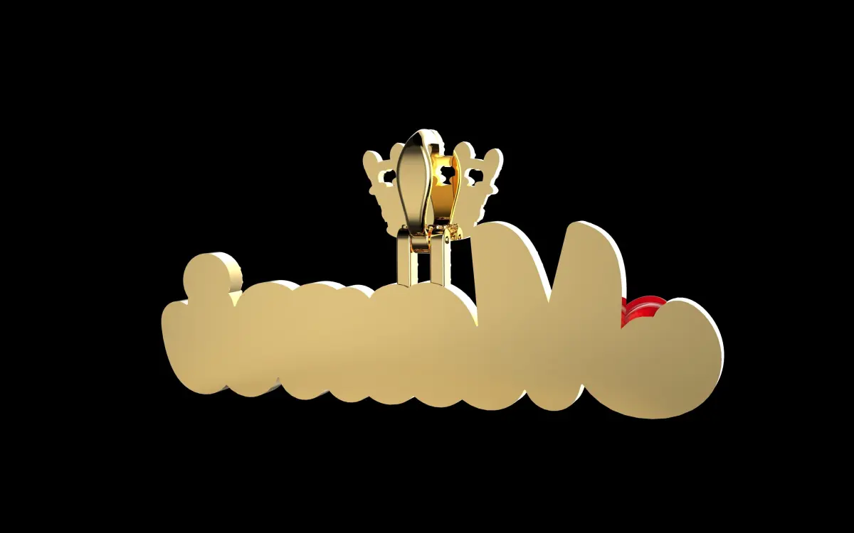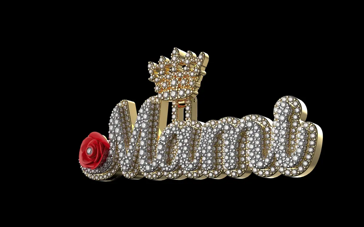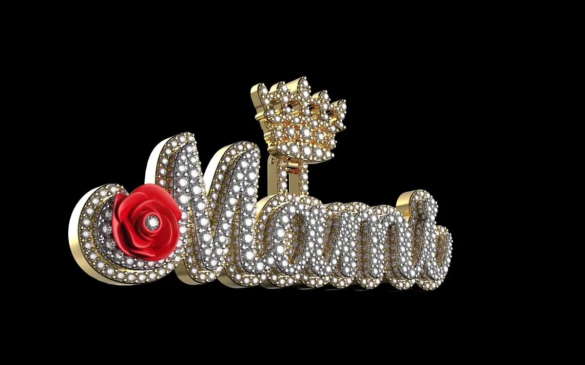 This Mami pendant is absolutely stunning and luxurious! It is encrusted with countless sparkling diamonds that cover the letters, creating a dazzling brilliance. The design is further enhanced by a golden outline, adding to its elegance and sophistication.