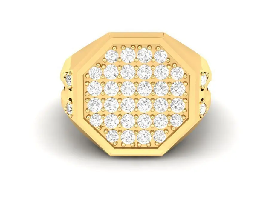 This 3D model features a luxury gold men’s ring with an octagon-shaped face fully set in pavé diamonds. The bold geometric design showcases brilliance across the entire surface, enhanced by additional accent stones on the shoulders of the band. With its wide structure and polished finish, this ring delivers strength, prestige, and timeless masculine elegance.