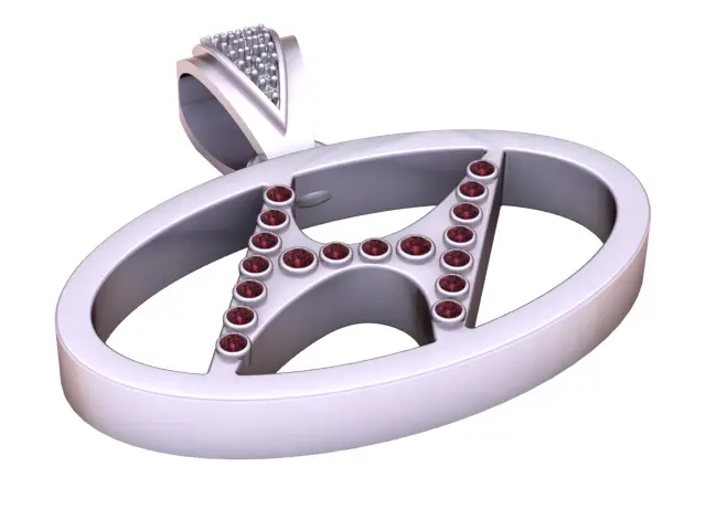 Embody bold expression with this striking gold pendant, featuring a modern take on the peace symbol. The centerpiece is adorned with deep red gemstones arranged in precise symmetry, offering a dramatic contrast against the polished golden base. The open design provides a sense of lightness while maintaining a strong presence. The elegantly detailed bail, accented with sparkling diamonds, enhances the pendant's luxurious charm. Perfect for those who value individuality, balance, and timeless messages reimagined in a contemporary, high-end style.