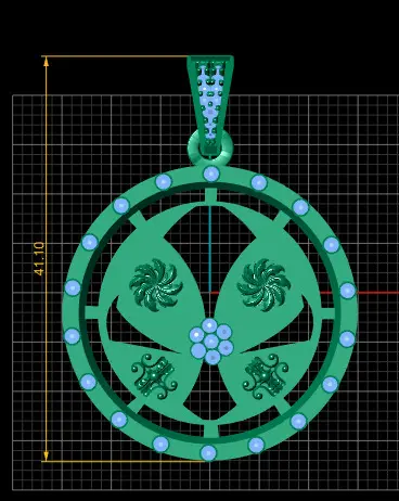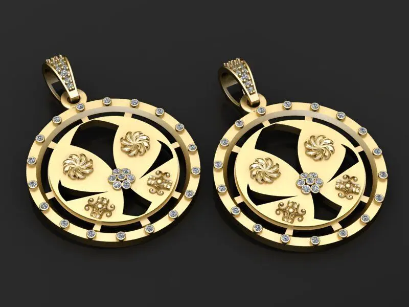 This exquisite 3D model showcases a beautifully crafted gold pendant with a circular design. The pendant features an intricate arrangement of four petal-like shapes radiating from a central cluster of sparkling diamonds. Surrounding the petals are smaller ornamental gold motifs, adding an elegant and luxurious touch. The outer rim is adorned with evenly spaced diamond accents that enhance the pendant's brilliance and sophistication. The bail of the pendant also carries detailed diamond embellishments, making this piece perfect for high-end jewelry presentations, digital catalogs, or luxury accessory visualizations.