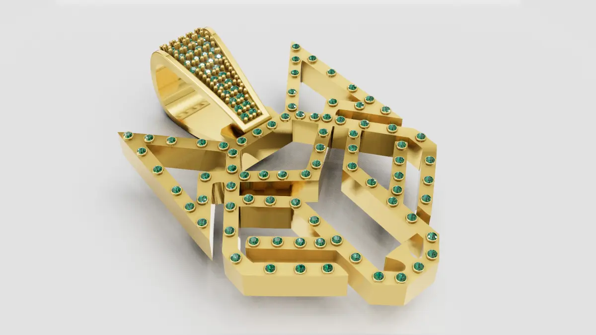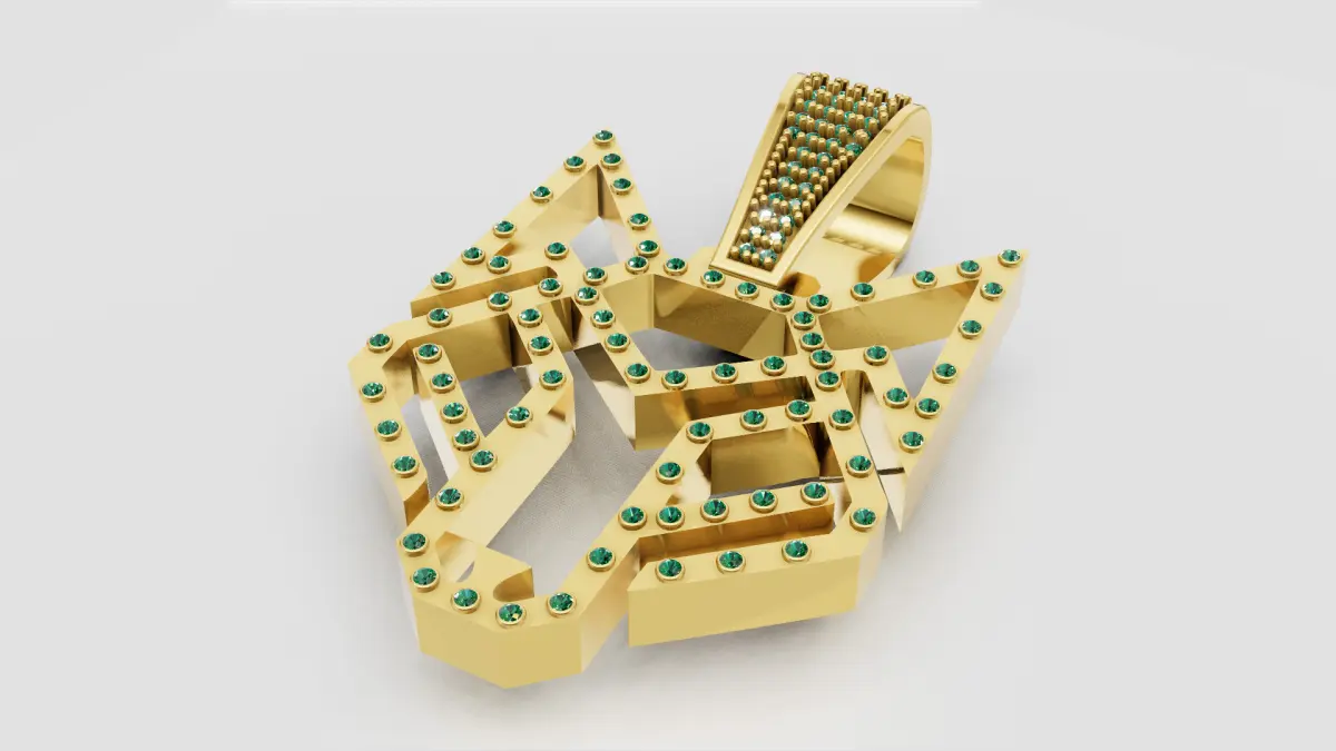 A striking geometric gold pendant that commands attention with its futuristic angular design and intricate openwork structure. Adorned with vibrant green gemstones meticulously placed along every edge, the piece combines bold symmetry with refined luxury. The wide bail is also encrusted with matching stones, ensuring elegance from every angle. This pendant is ideal for those who appreciate architectural jewelry and a confident, standout style.