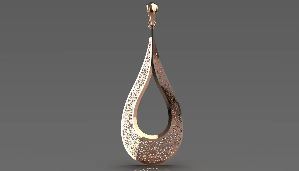 This pendant features a beautiful and intricate teardrop design crafted from polished rose gold. Its openwork structure allows light to pass through, creating a delicate and airy feel.