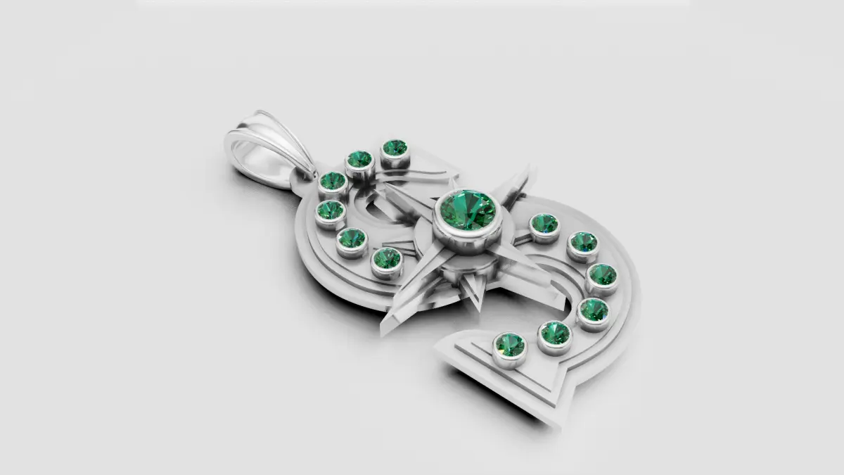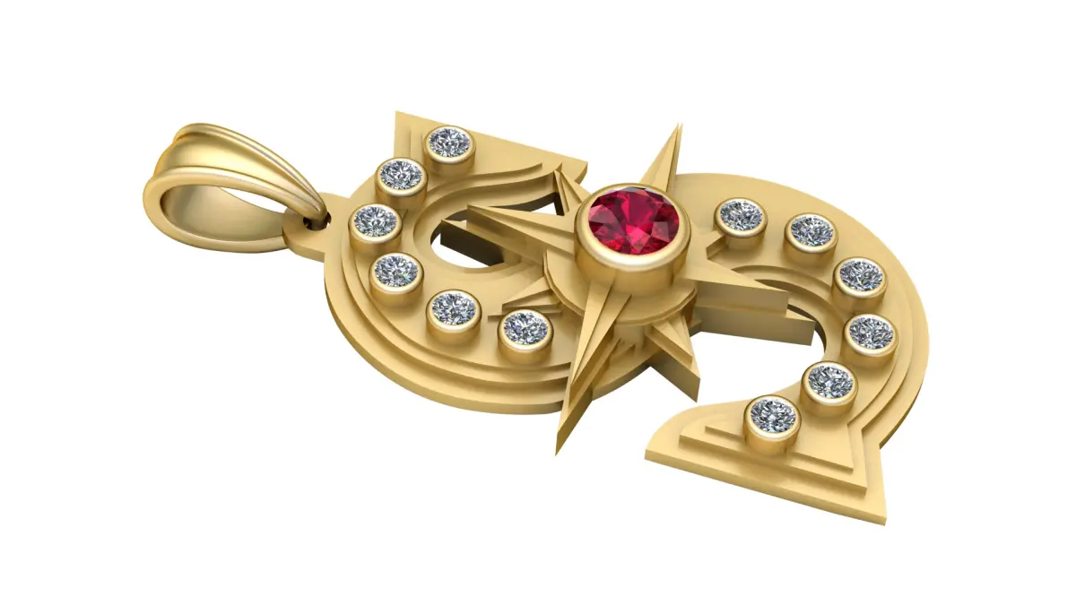 This exquisite pendant design showcases a modern fusion of geometry and elegance. Crafted in rich yellow gold, the pendant features a bold circular and arrowhead structure with precise layered detailing. The centerpiece is adorned with a brilliant round-cut ruby, securely bezel-set within an intricate star-shaped frame. Surrounding the pendant are twelve perfectly positioned round brilliant-cut diamonds, adding a captivating sparkle that enhances its luxurious appeal. Ideal for both everyday elegance and special occasions, this pendant reflects superior craftsmanship and a contemporary artistic touch.