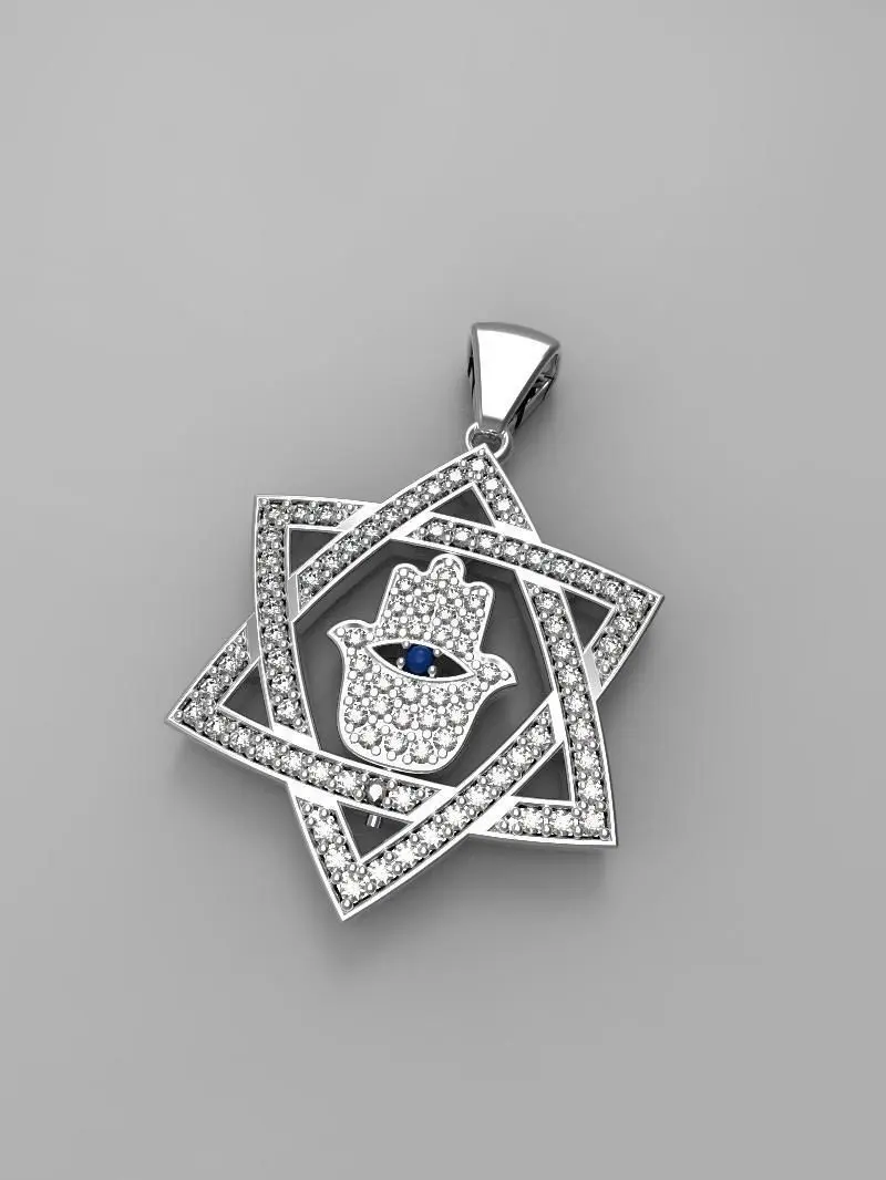 RUBY design a gold pendant with a hamsa hand inside a Star of David. The hamsa hand is a palm-shaped symbol that is widely used as an amulet in Middle Eastern and North African cultures. It is believed to provide protection against the evil eye. The Star of David is a hexagonal symbol that is one of the most recognizable symbols of Judaism. It is often used in jewelry and other decorative items.The pendant made of 14K gold. The hamsa hand and Star of David are both outlined with small diamonds. The pendant is attached to a delicate gold chain.This type of pendant is a popular choice for people who want to express their faith or heritage. It can also be seen as a symbol of good luck and protection.
