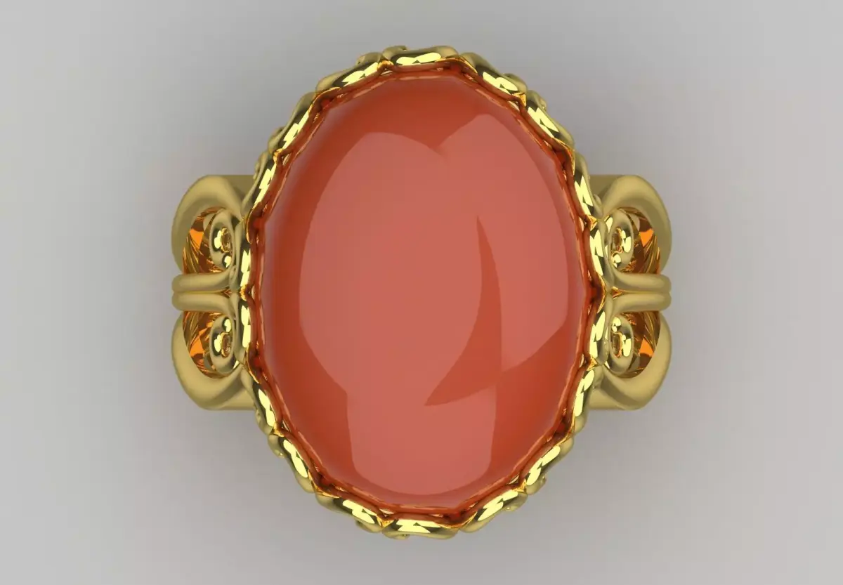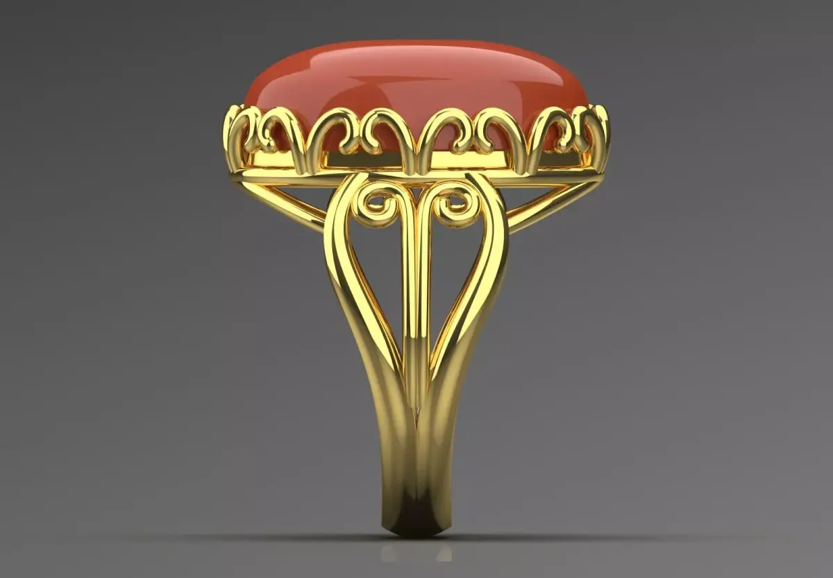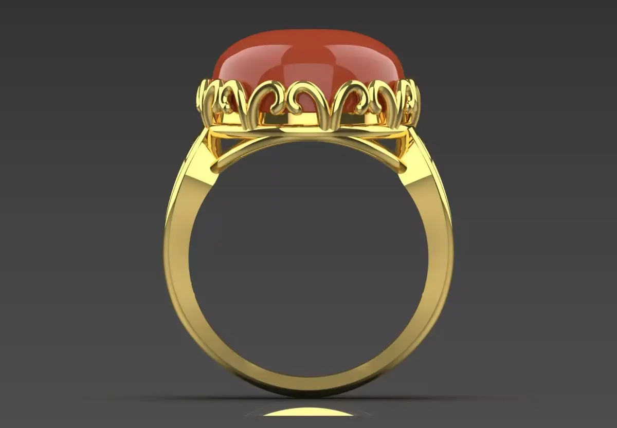 - Large Gemstone: At the center of the ring, a large cabochon-cut gemstone in red or dark brown is placed.
