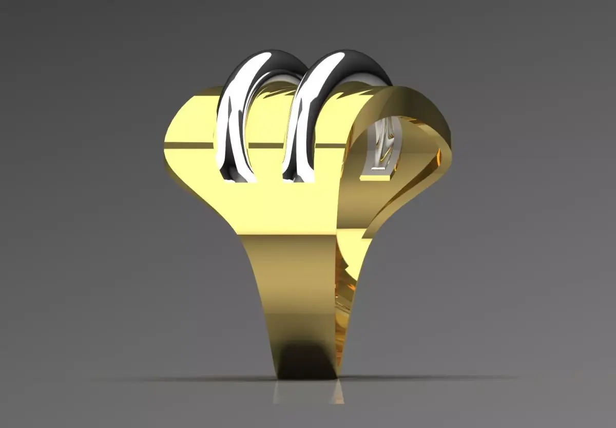 With its wide and modern design, this ring is made up of shiny metal bands in yellow gold and silver (possibly white gold) colors, which are placed parallel and slightly apart on the surface of the ring. This two-tone combination and bulky appearance give the ring a prominent and contemporary look, which is an ideal choice for those looking for jewelry with a powerful, stylish and different look.