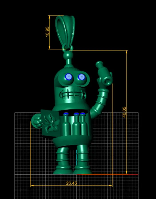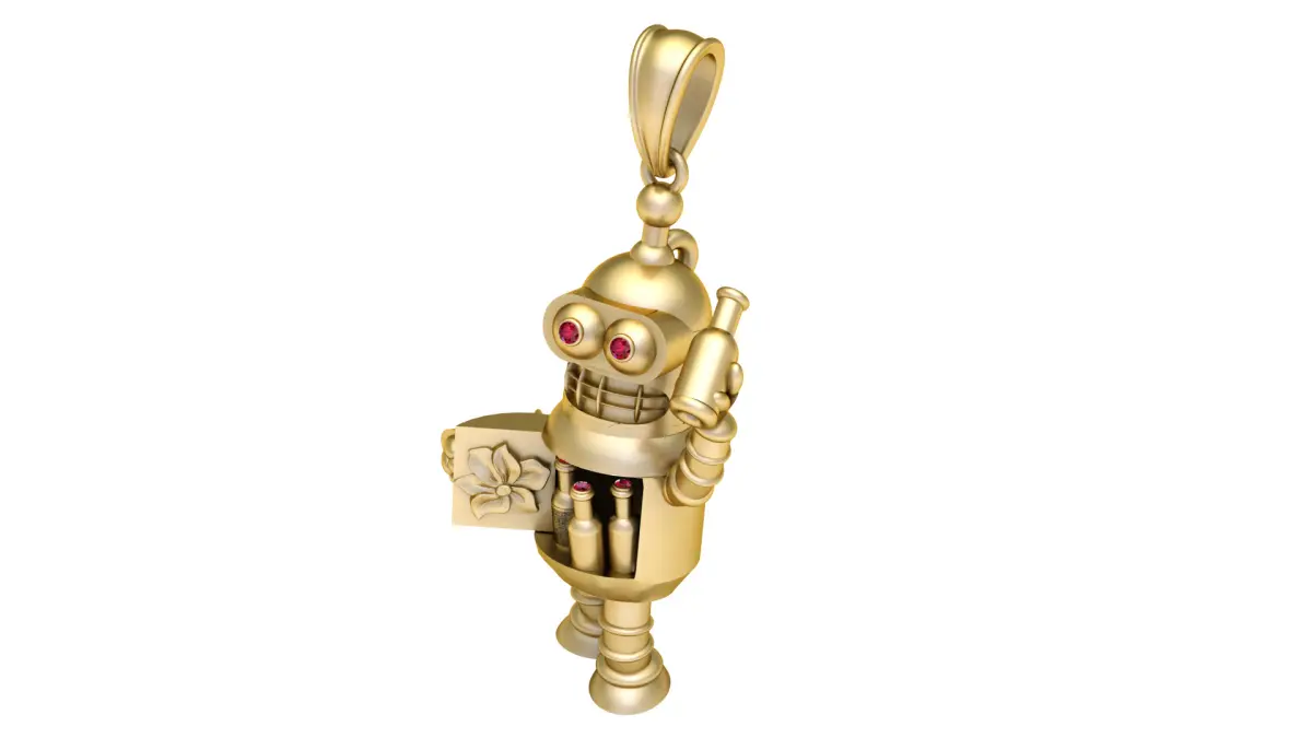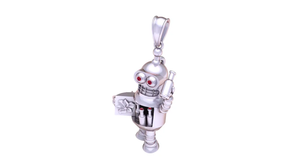 This creative and playful robot pendant is a true statement piece, combining modern artistry with fine craftsmanship. Cast in polished yellow gold, the pendant features a highly detailed robot design with ruby gemstone eyes, adding a vibrant pop of color. The robot holds a miniature bottle in one hand while opening its compartment door to reveal more bottles inside, showcasing intricate detailing and charm. Perfect for collectors, sci-fi lovers, or anyone who appreciates bold and whimsical jewelry.