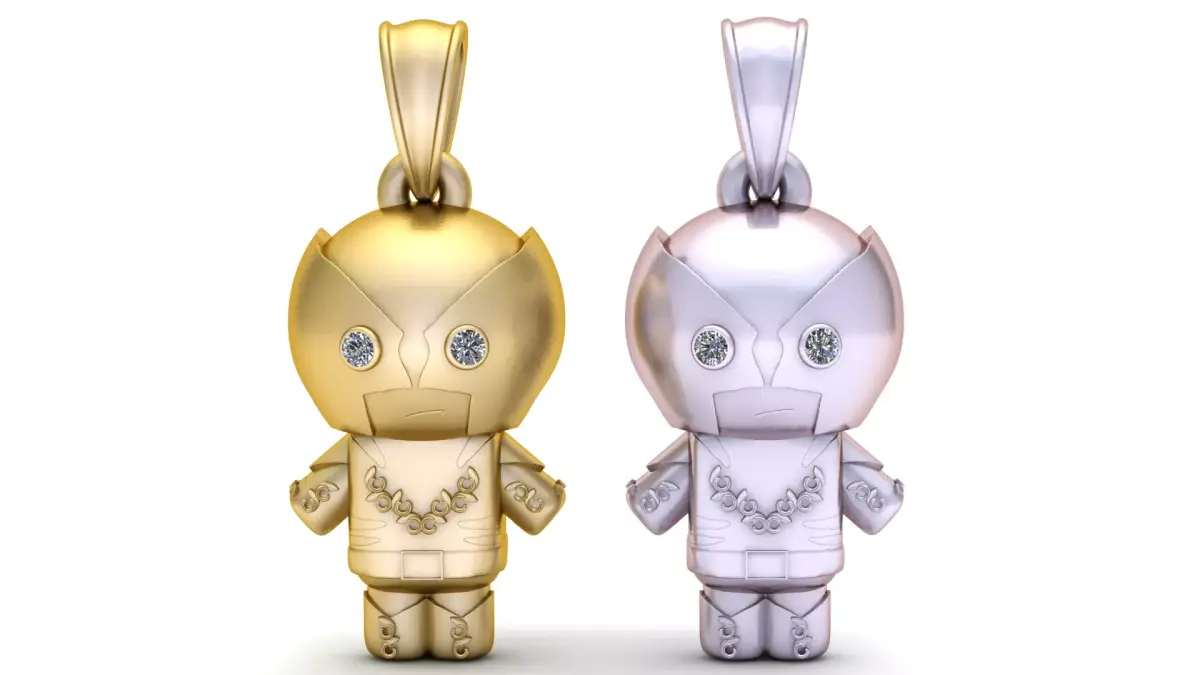This is a whimsical and modern pendant in the form of a stylized, cartoonish robot. Crafted from polished gold, the design features a rounded head, a structured body with articulated arms, and small legs. The robot's face is simple yet expressive, with its eyes represented by two sparkling brilliant-cut diamonds. A delicate, floral-like motif is sculpted on its chest, giving the otherwise mechanical figure an elegant and surprising detail. The bail at the top is simple and sleek, allowing the charm to be the centerpiece. This pendant is a unique and playful piece, perfect for anyone who loves futuristic themes, unique accessories, or a touch of nerdy elegance