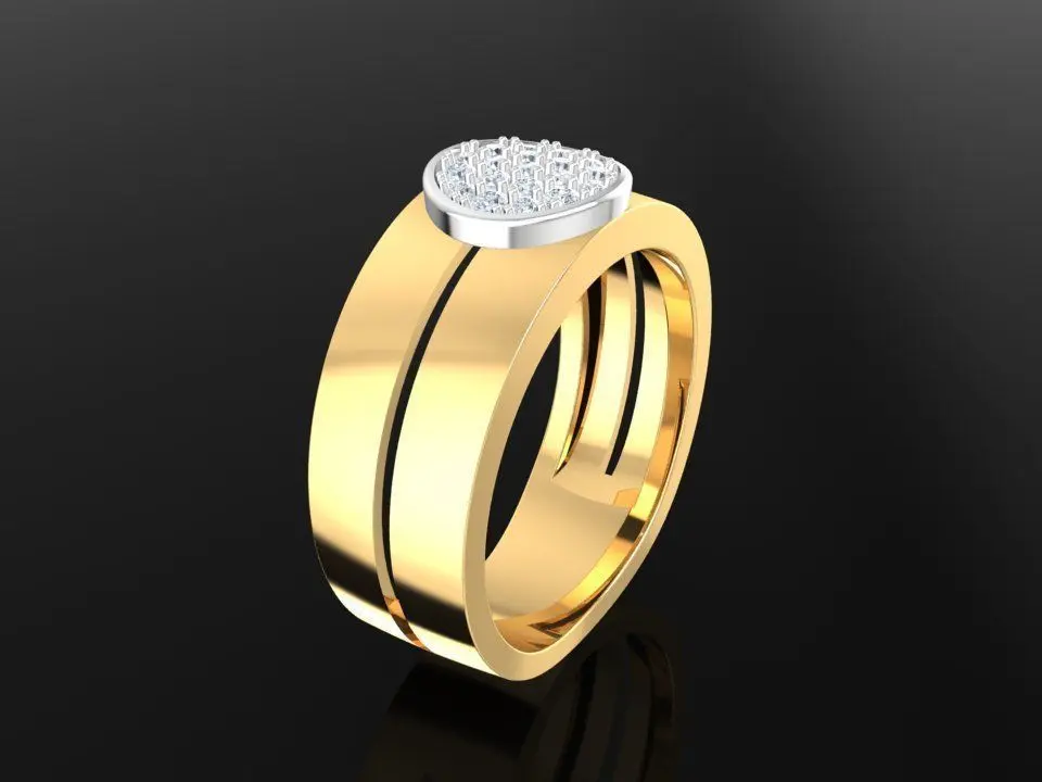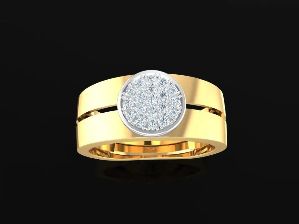 This is a high quality 3D model of a gold men ring featuring a round diamond cluster setting. The design includes multiple small diamonds arranged in a circular shape, creating a brilliant and luxurious sparkle. With a solid gold band, this ring showcases both elegance and strength, making it perfect for men's jewelry collections.