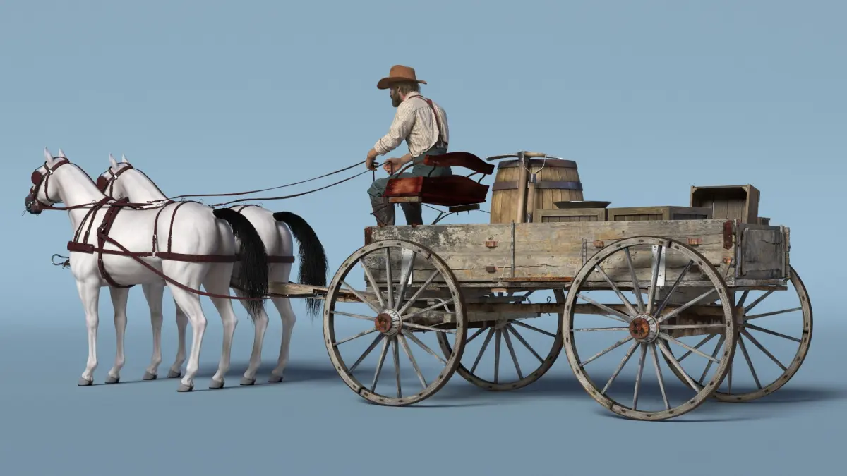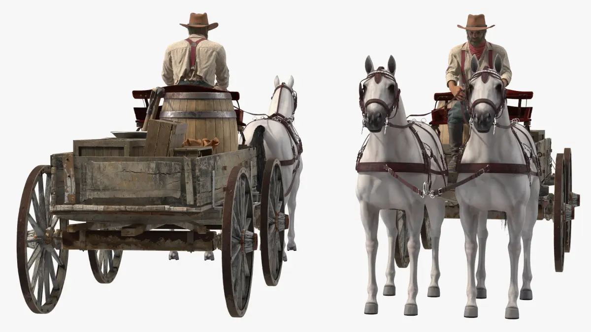 Gold Rush Miner with Wagon and Horses is a high quality, photo real 3d model that will enhance detail and realism to any of your rendering projects. The model has a fully textured, detailed design that allows for close-up renders, and was originally modeled in 3ds Max 2020 and rendered with V-Ray. Renders have no postprocessing!
