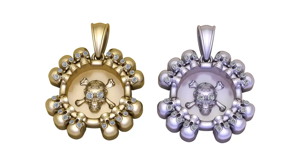 This bold pendant design features three intricately crafted golden skulls, symbolizing strength, rebellion, and edgy style. Each skull is accented with sparkling diamond-set eyes, adding a luxurious contrast to the fierce design. Surrounded by sharp leaf-like engravings, the pendant embodies a raw and daring aesthetic, making it a perfect statement piece for those who embrace unique, gothic-inspired jewelry.