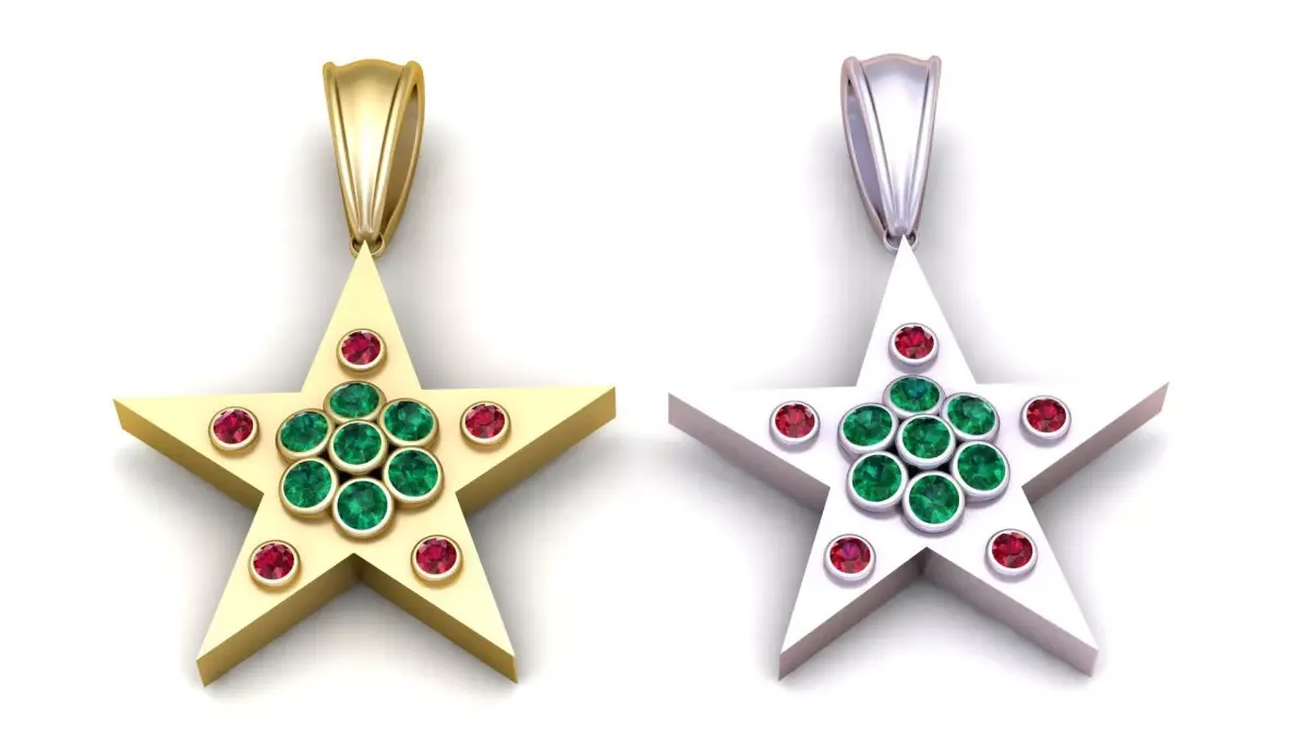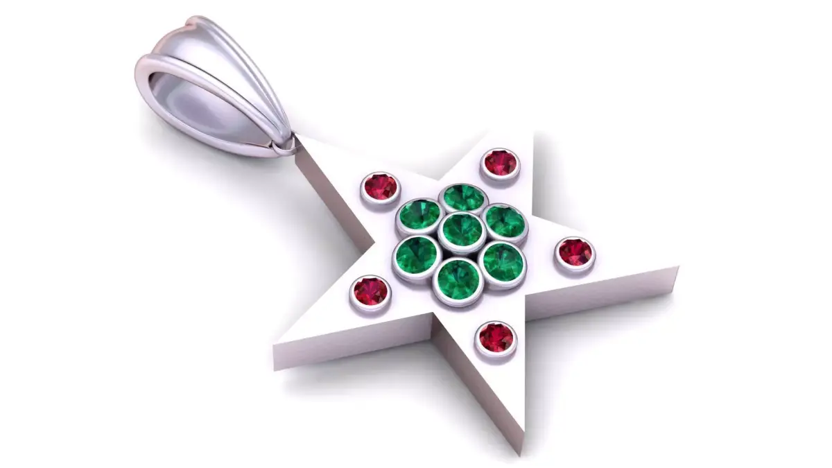 This dazzling star-shaped gold pendant is adorned with vibrant green and red gemstones, symbolizing brilliance, celebration, and timeless elegance. At the center lies a cluster of radiant emerald-like complemented by ruby-inspired gems on each point creating a perfect harmony of color and shine. A versatile piece that works beautifully for festive occasions daily elegance or a thoughtful gift