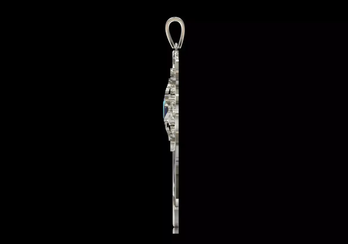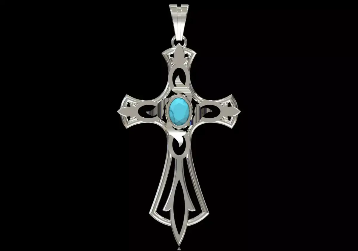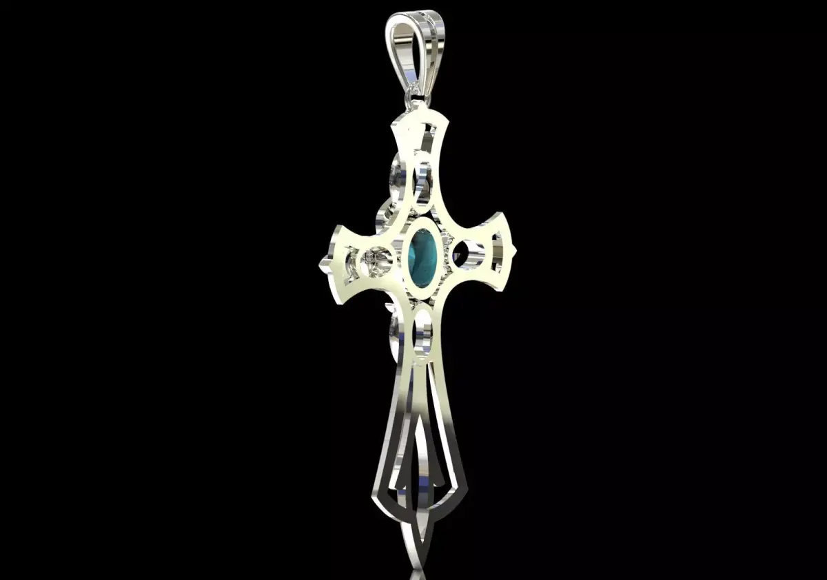- Turquoise Center Stone: At the center of the cross, there is an Oval Cut gemstone with a turquoise blue color (possibly turquoise or blue topaz) set in a simple, polished frame.