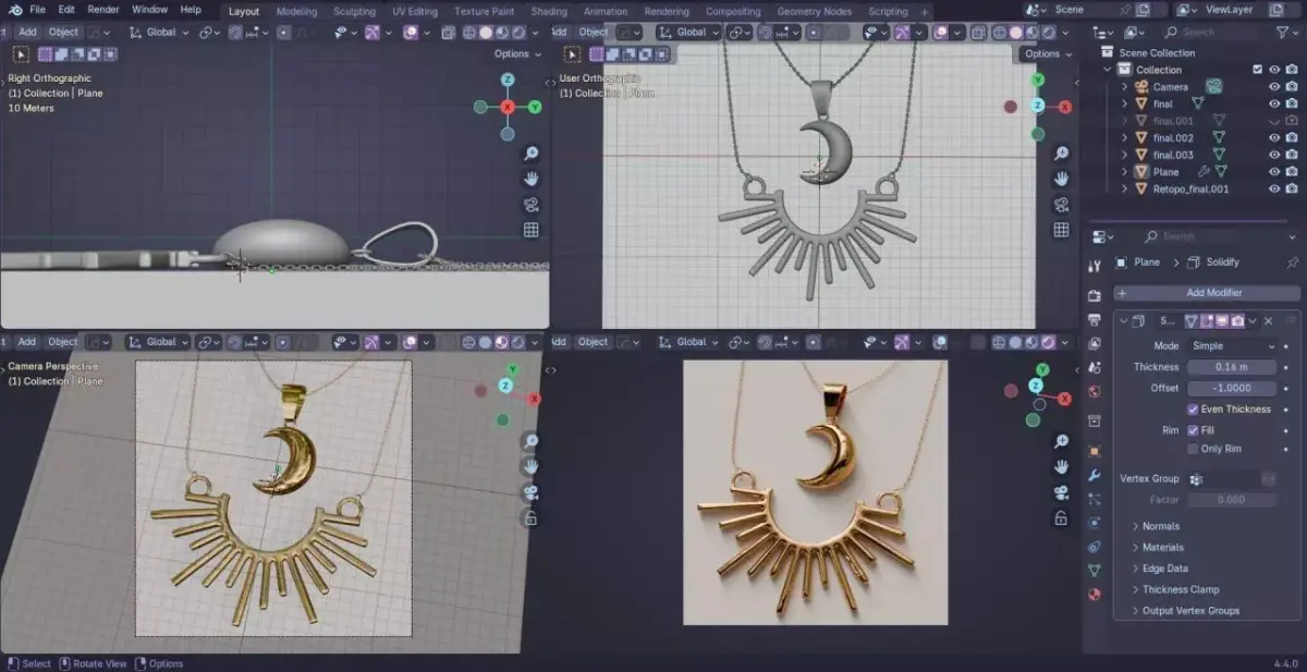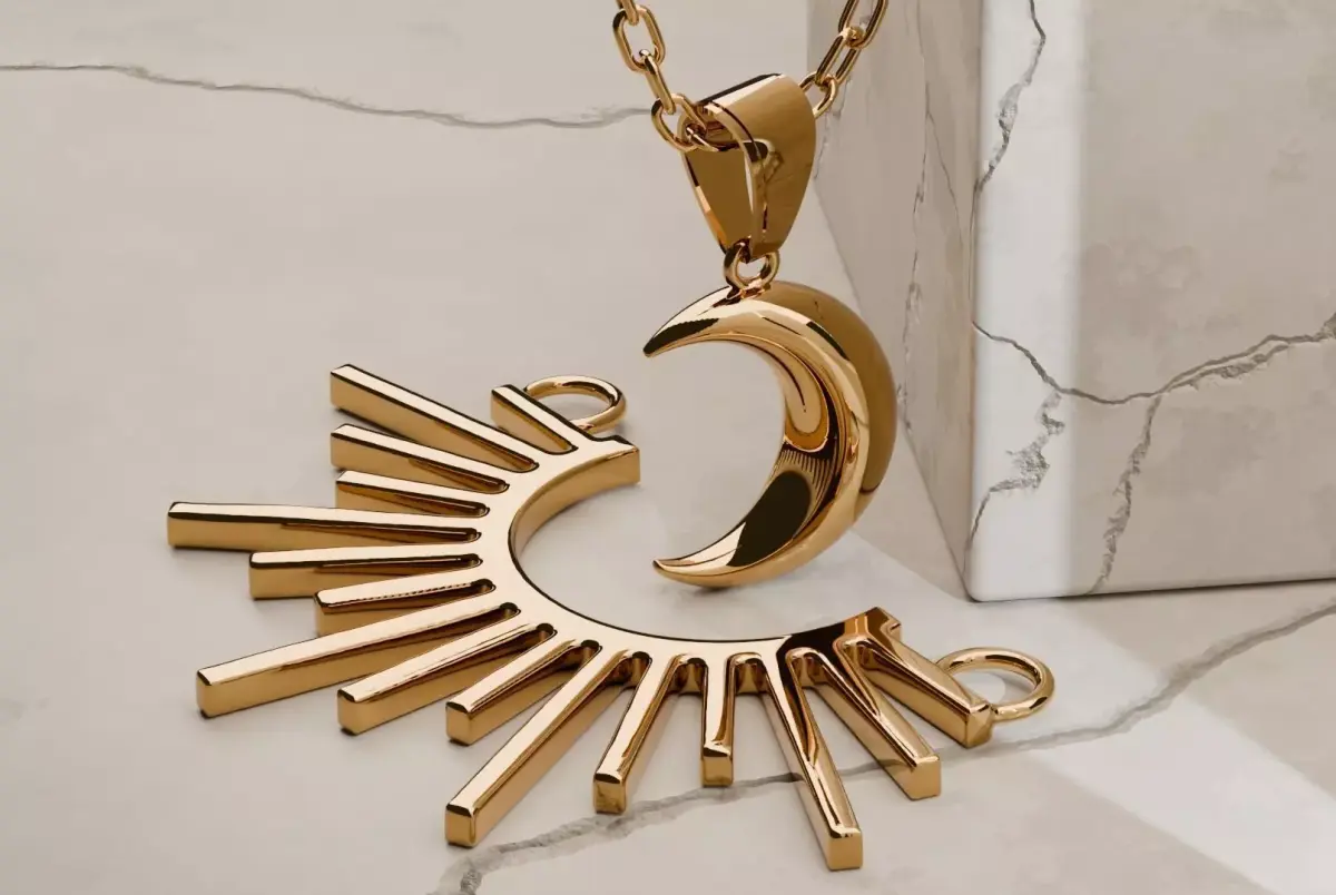 High-detail luxury jewelry set: 18K gold crescent moon pendant + sunburst necklace. Clean, watertight geometry optimized for 3D printing and rendering. Real-world scale, PBR polished gold material.Files included:• Native: .blend (Blender 3.6+)• .fbx | .glb | .obj + .mtl | .stl (print-ready)• 4K textures + preview images + 360° turntable video (MP4)I can quickly make silver, white gold, rose gold versions or add diamonds/gemstones Just message me!