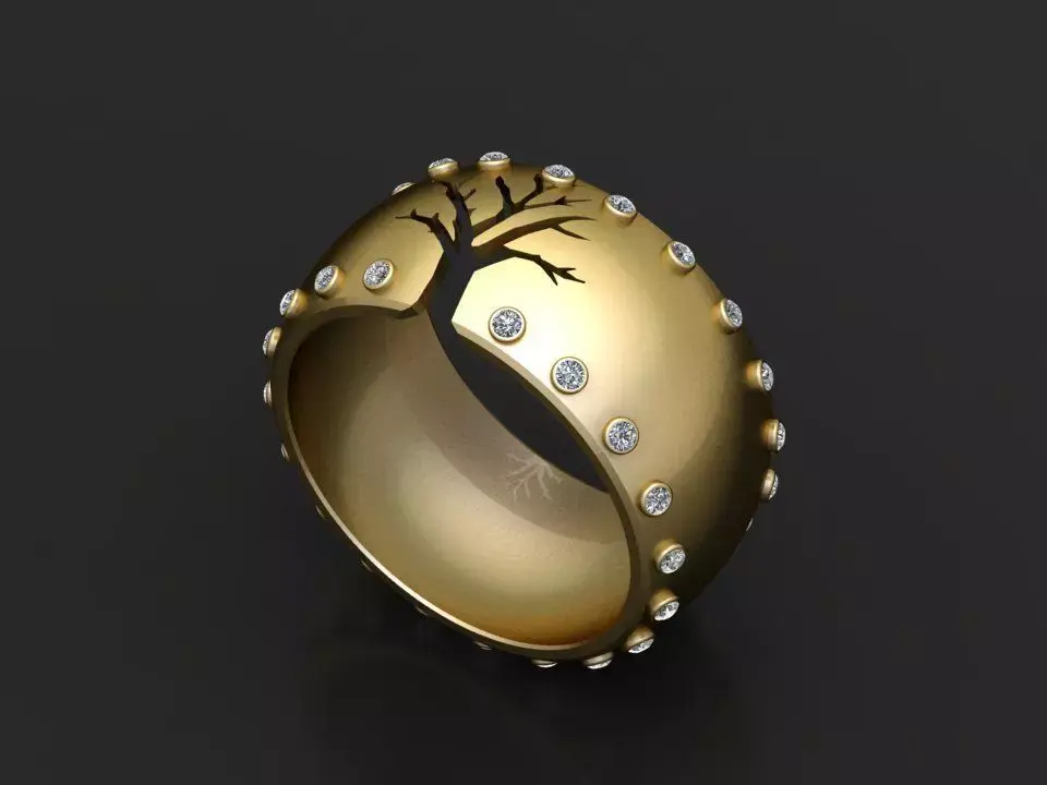 This elegant gold ring features a unique cut-out silhouette of a tree, symbolizing life, growth, and resilience. The band is adorned with meticulously set gemstones that create a shimmering border, enhancing its luxurious appeal. The open gap design adds a contemporary twist to a classic round shape, making it both symbolic and fashion-forward.
