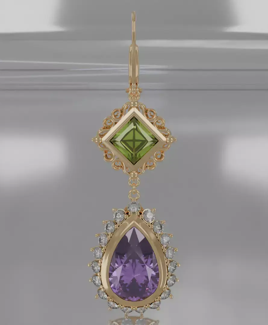 This elegant 3D earring model combines classic style with modern refinement, creating a piece that radiates luxury and harmony. The upper part features a decorative gold setting with delicate filigree details, holding a vivid square-cut green gemstone (peridot). Its fresh color symbolizes energy, renewal, and vitality.