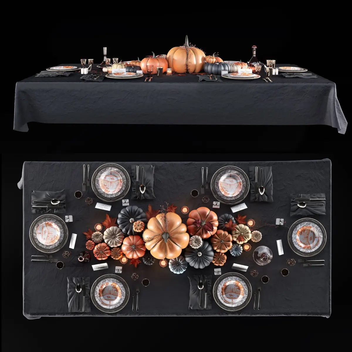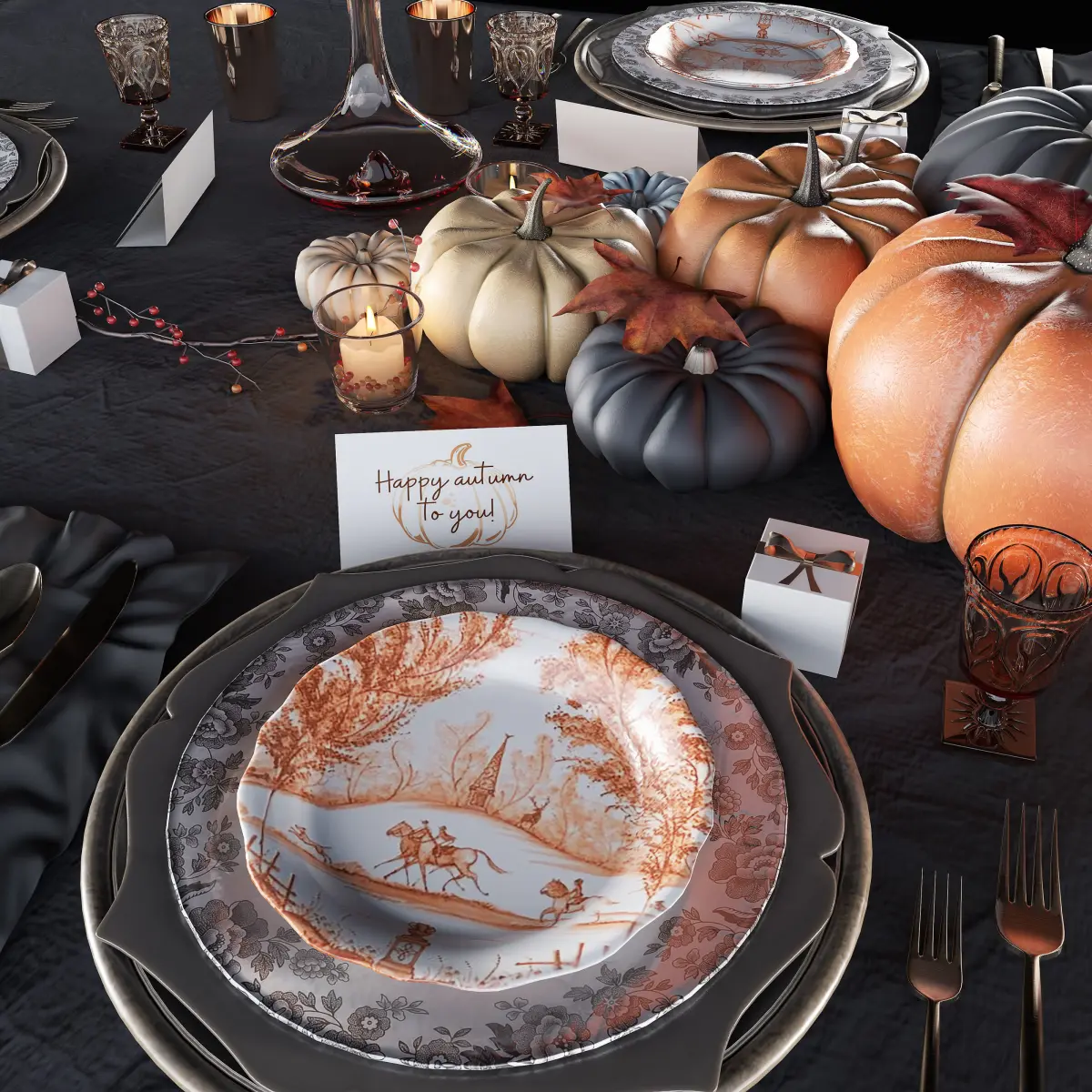 Photorealistic high-quality 3D model of autumn-themed table setting with pumpkins decoration.