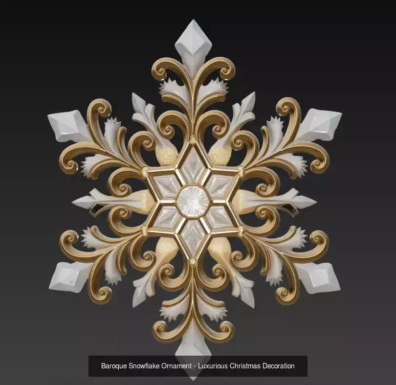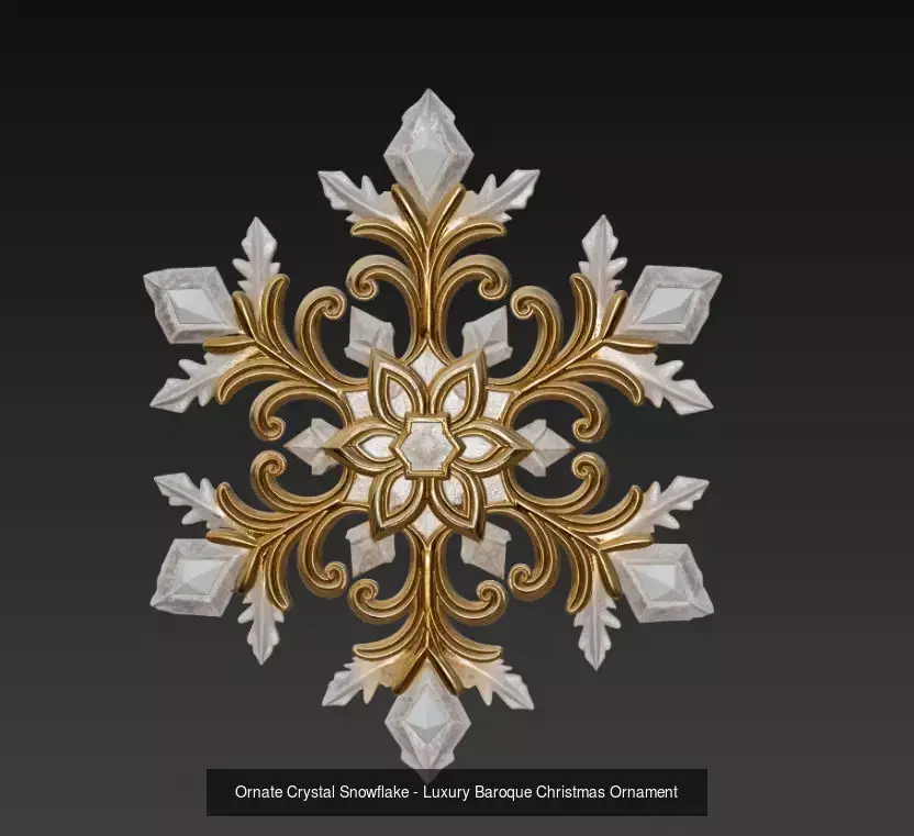 Add elegance and festive brilliance to your holiday designs with the Golden Baroque Snowflake Collection, a 4-model premium set of luxurious Christmas ornaments.Each piece blends baroque craftsmanship with modern 3D artistry — featuring crystal-like geometry, ornate symmetry, and shimmering gold details.