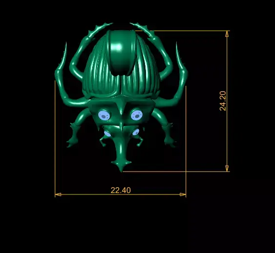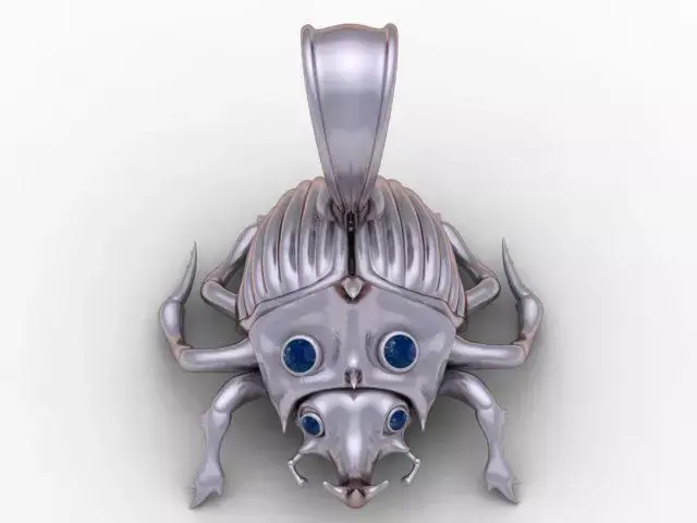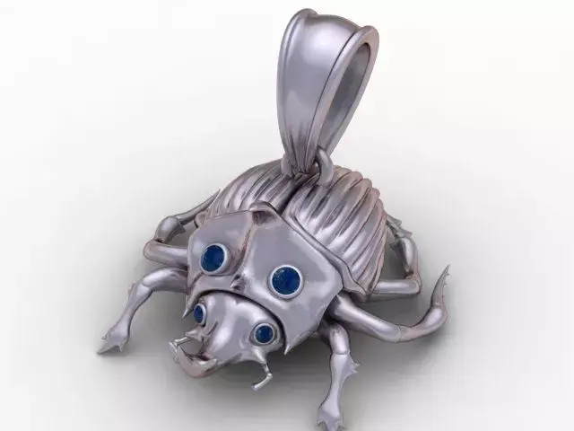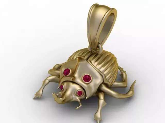 This unique 3D printable pendant features a beautifully sculpted beetle-inspired design, crafted with smooth organic curves and a luxurious golden finish. The body of the beetle showcases intricate detailing, including segmented textures, stylized legs, and a bold armored head Four vibrant gemstone inlays on the head and face add a striking, eye-catching contrast, giving the piece a mysterious and elegant appearance. The bail is sleek and refined, allowing the pendant to hang naturally while enhancing its premium jewelry aesthetic