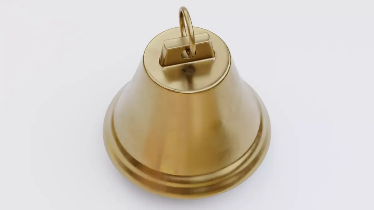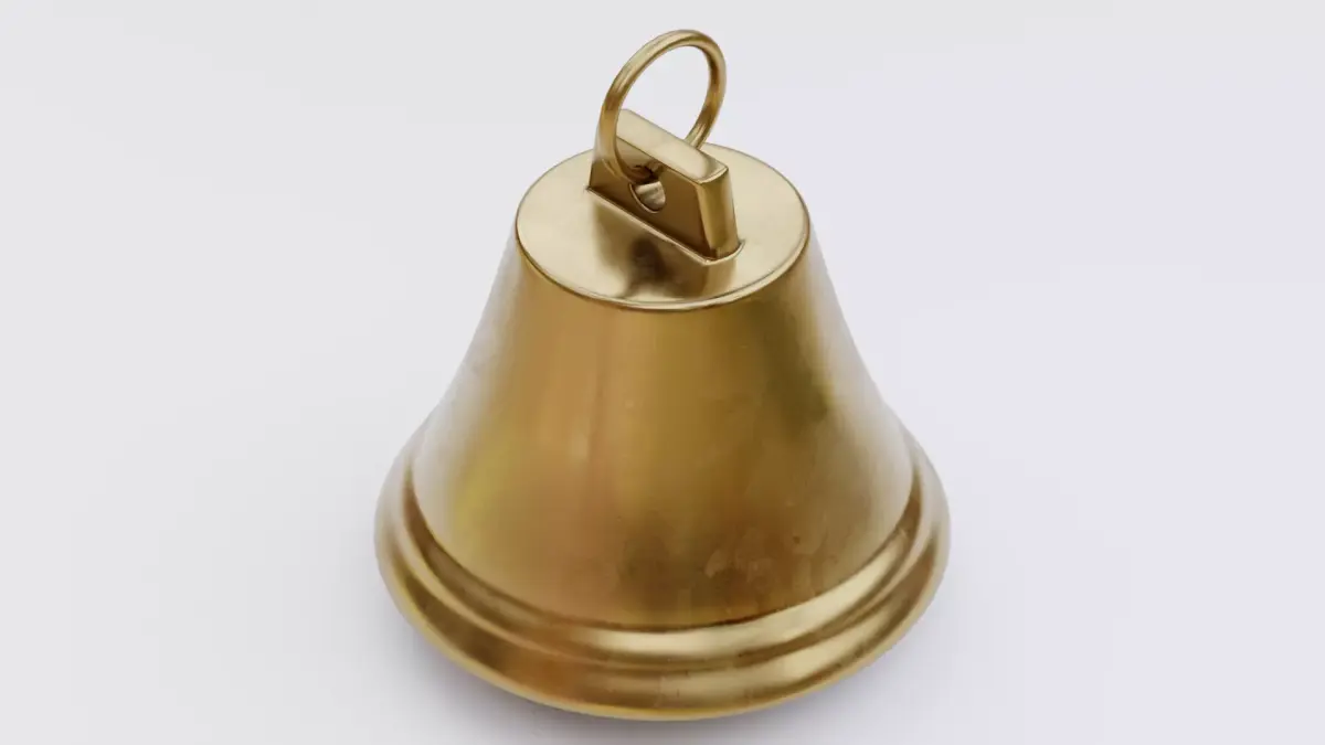 A high-quality 3D model of a golden metal bell featuring a smooth reflective surface with subtle imperfections for a natural metallic look. The design includes a realistic clapper inside and a loop on top for hanging, making it ideal for both holiday decorations and general interior scenes. Its warm gold material, precise geometry, and authentic proportions ensure believable reflections and shading.