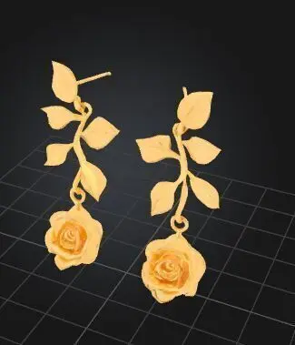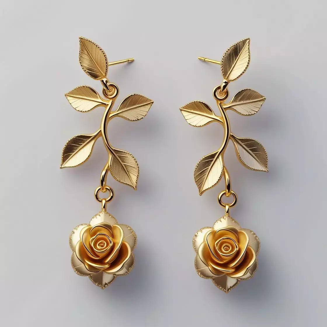 This image shows a pair of very delicate and artistic earrings with a rose and tree leaf design. The design is inspired by nature and has a very luxurious and feminine look.The design is in the form of a branch of a plant with four leaves at the top