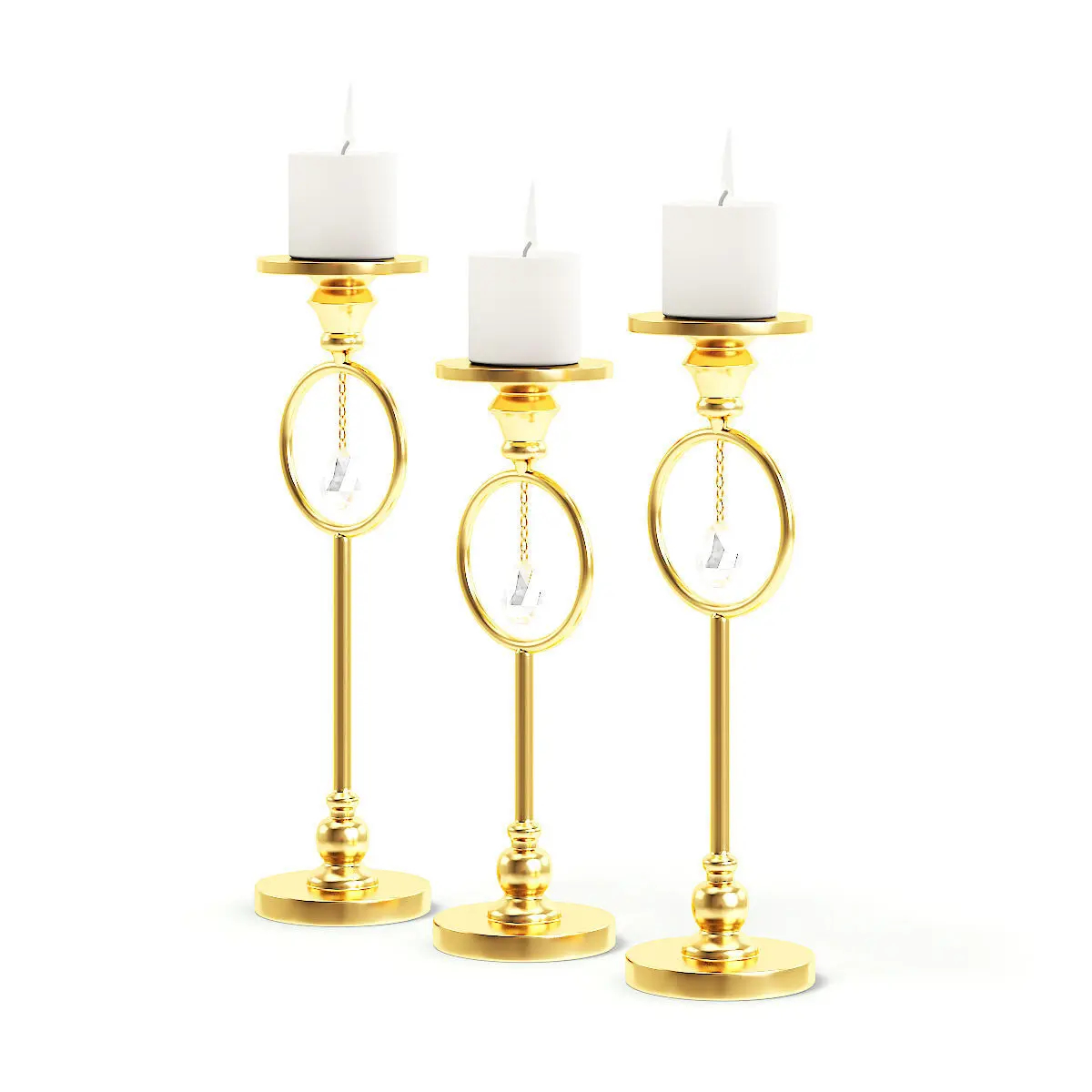 Three golden candlesticks 3d model with burning candles and decorative crystal. Compatible with 3ds max 2010 (V-Ray, Mental Ray, Corona) or higher, Cinema 4D R15 (V-Ray, Advanced Renderer), FBX, OBJ and Unreal Engine.