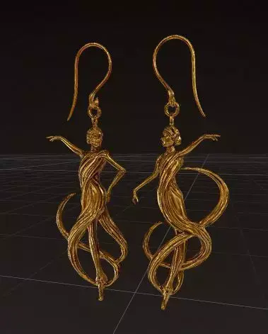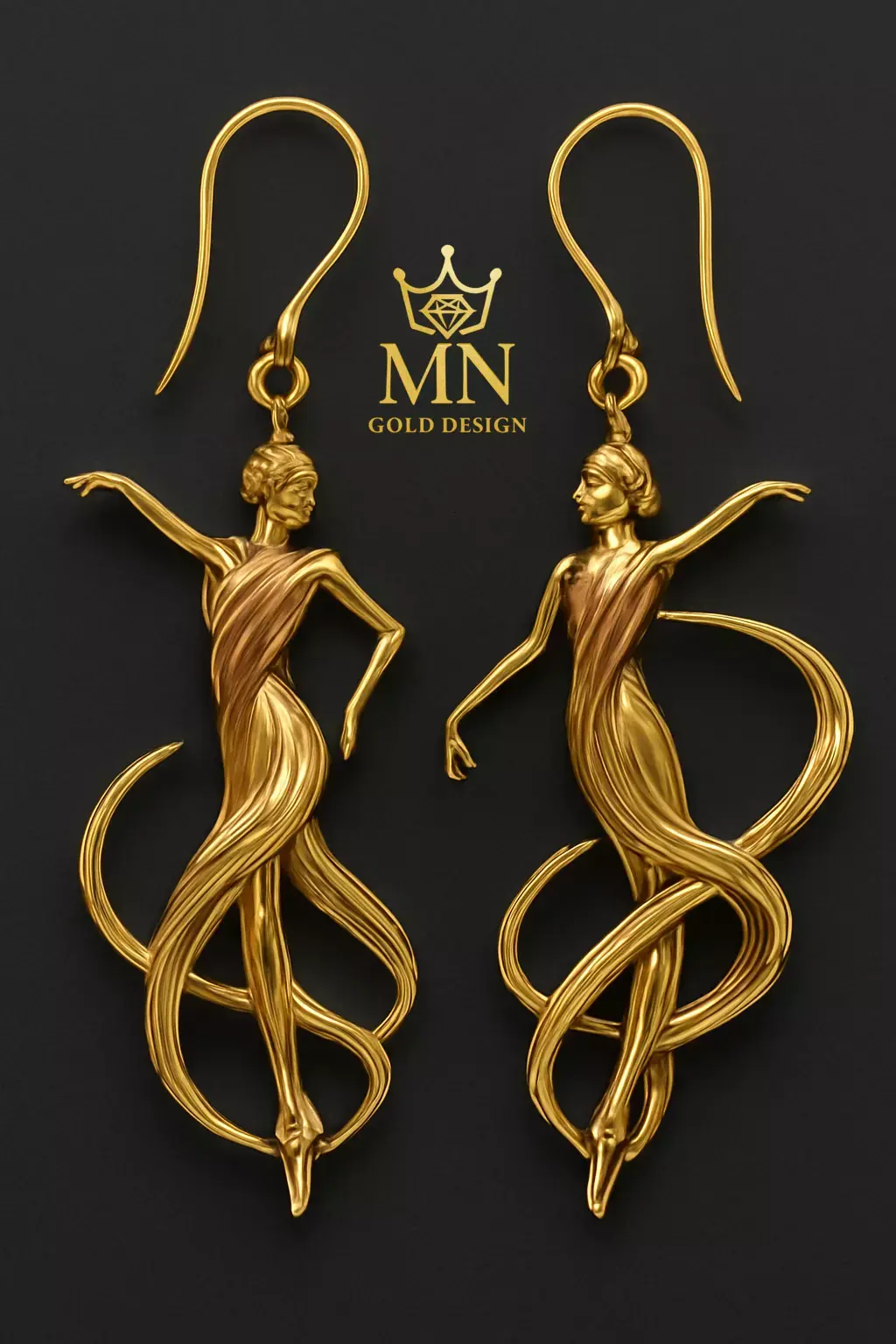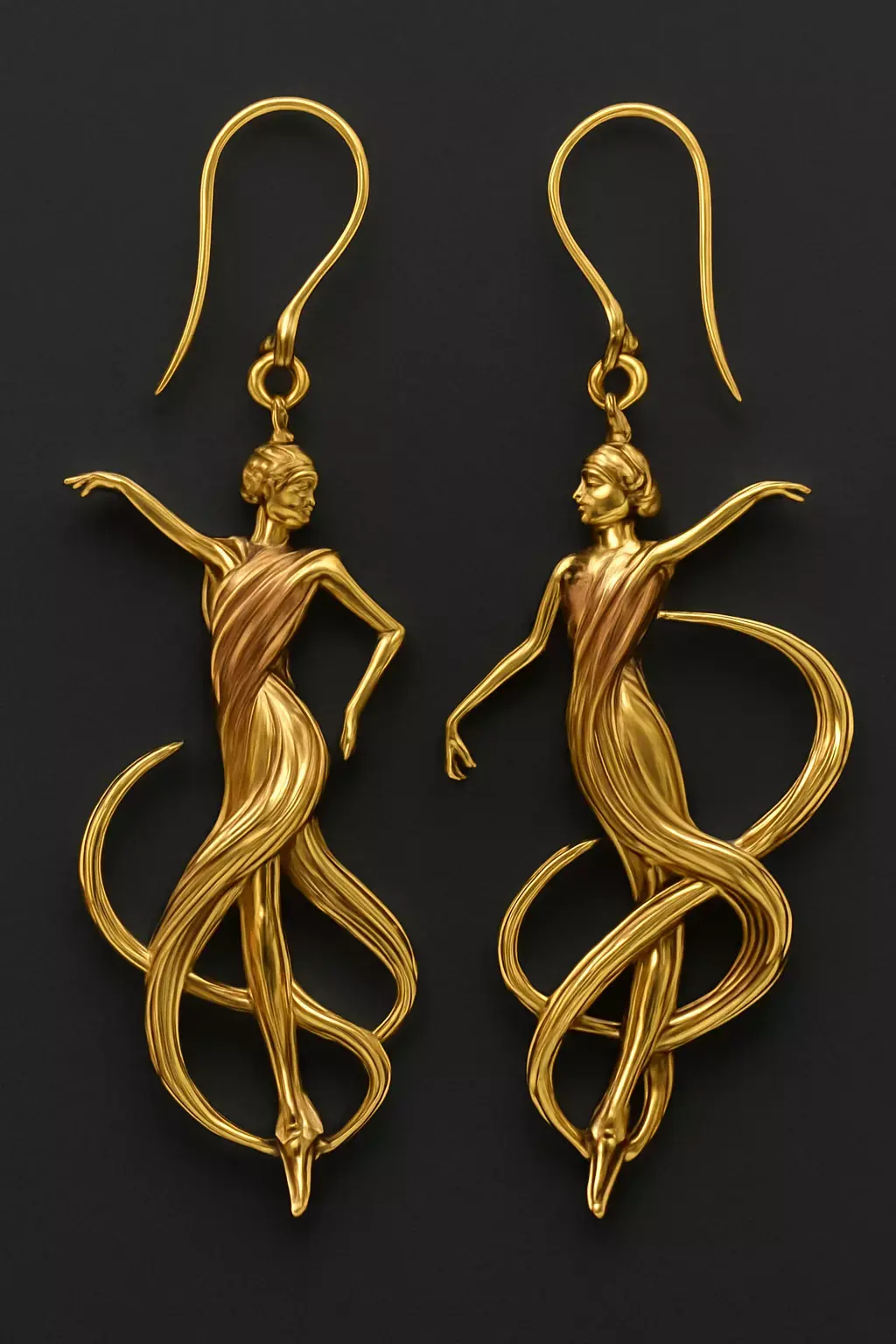 The artistic Golden Dance of Light earrings are inspired by Art Nouveau designs, beautifully capturing the elegance and fluid motion of a dancer in twisted, ribbon-like forms of gold. These earrings are meticulously crafted to showcase a stunning representation of a dancer in motion, with delicate curves and intricate details. The polished gold and vibrant red enamel accents emphasize the graceful forms, creating a dazzling contrast that is perfect for any elegant occasion.