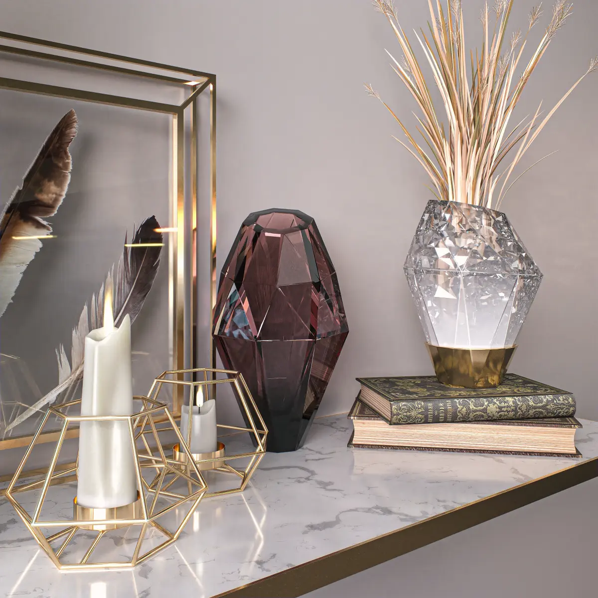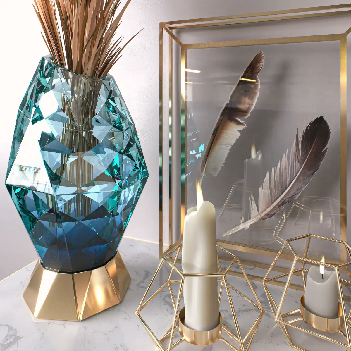 High Details Golden Decorative SetLow-Poly Model + High-Quality TexturesNo plugin neededAll objects are named and grouped and have their Multi / sub-object material.All colors can be easily changed.