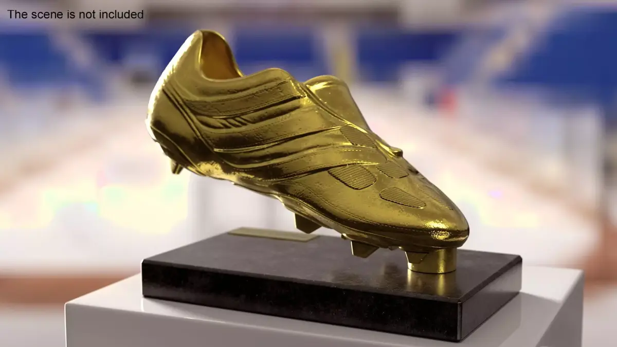 Golden Football Boot Trophy On Marble Base Mockup is a three-dimensional model of soccer cleat award that is an association football (soccer) commemorative trophy (prize reward trophy) that is a sculpting depiction of a soccer sport boot (cleat).