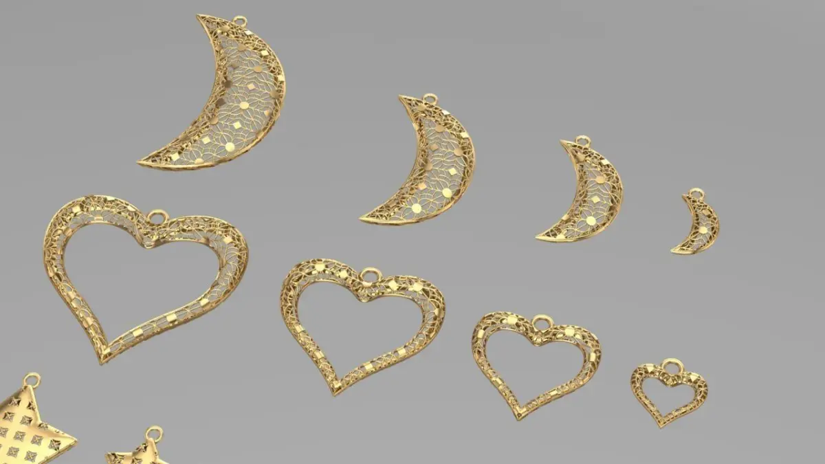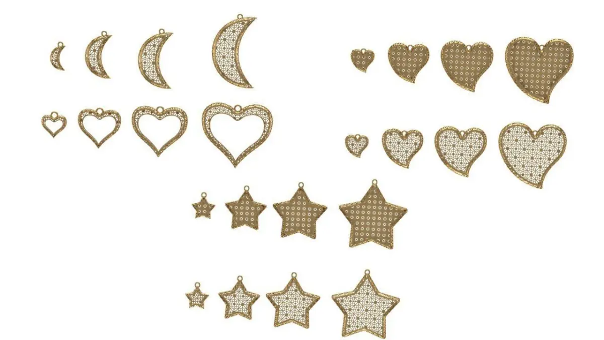 This collection showcases a series of 3D models, each evolving from a simple shape to a complex, patterned structure. The designs include hearts, moons, and stars, transitioning from solid forms to intricate lattice-like interiors. These models are perfect for those interested in 3D printing or digital modeling, demonstrating how basic shapes can be transformed into detailed and ornate pieces. Only meshes are available in stl and obj formats.