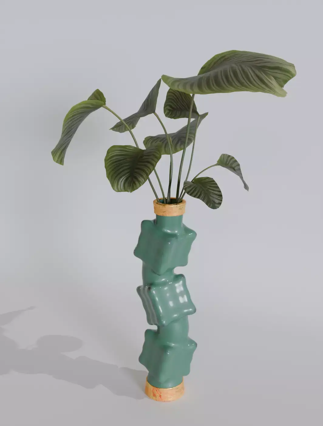 This vase design explores the boundary between functional object and modern sculpture.With bold geometric protrusions wrapping around its body, it carries a playful yet sophisticated character. The smooth ceramic-like material contrasts with the irregular surface, while the golden rim detail adds refinement and a touch of luxury.