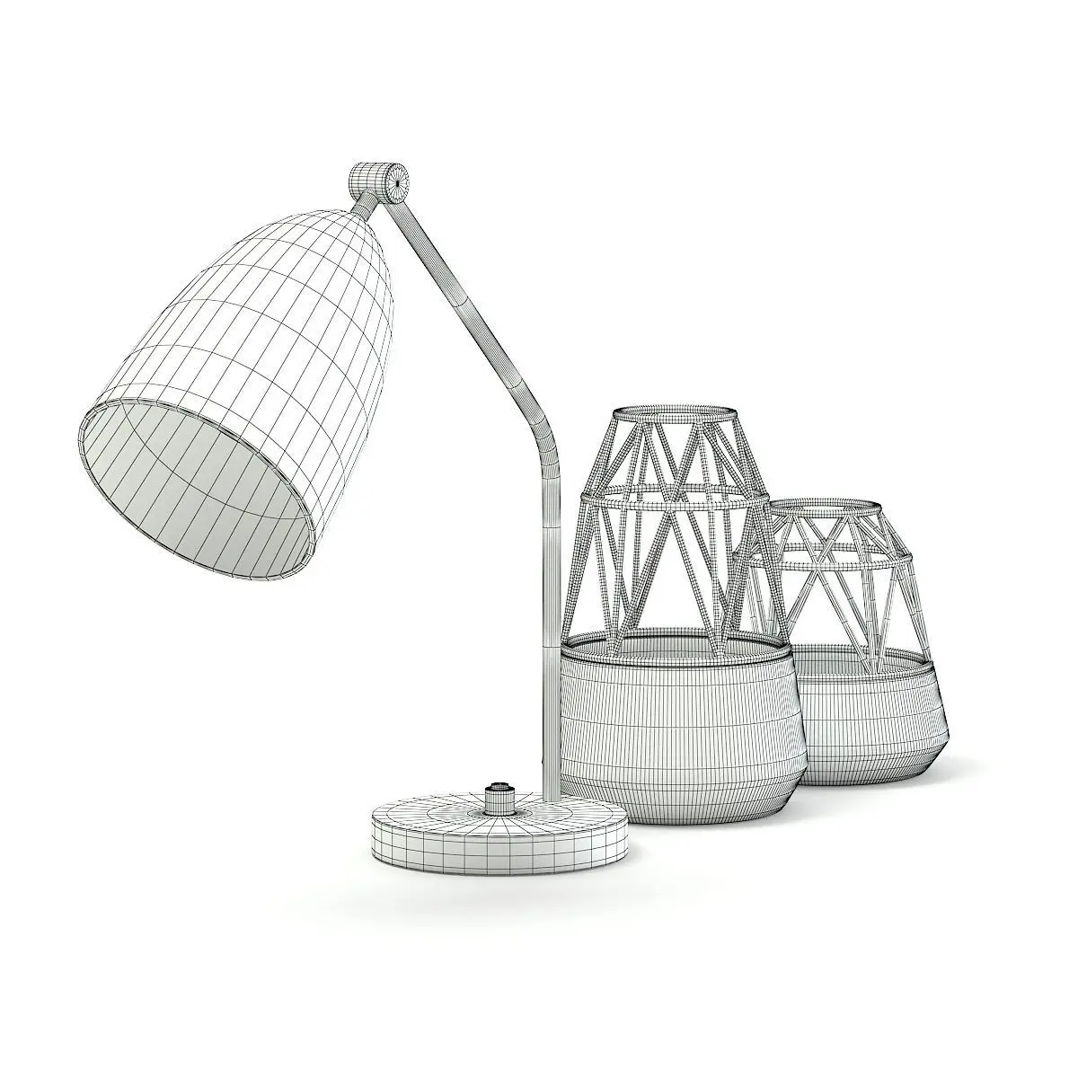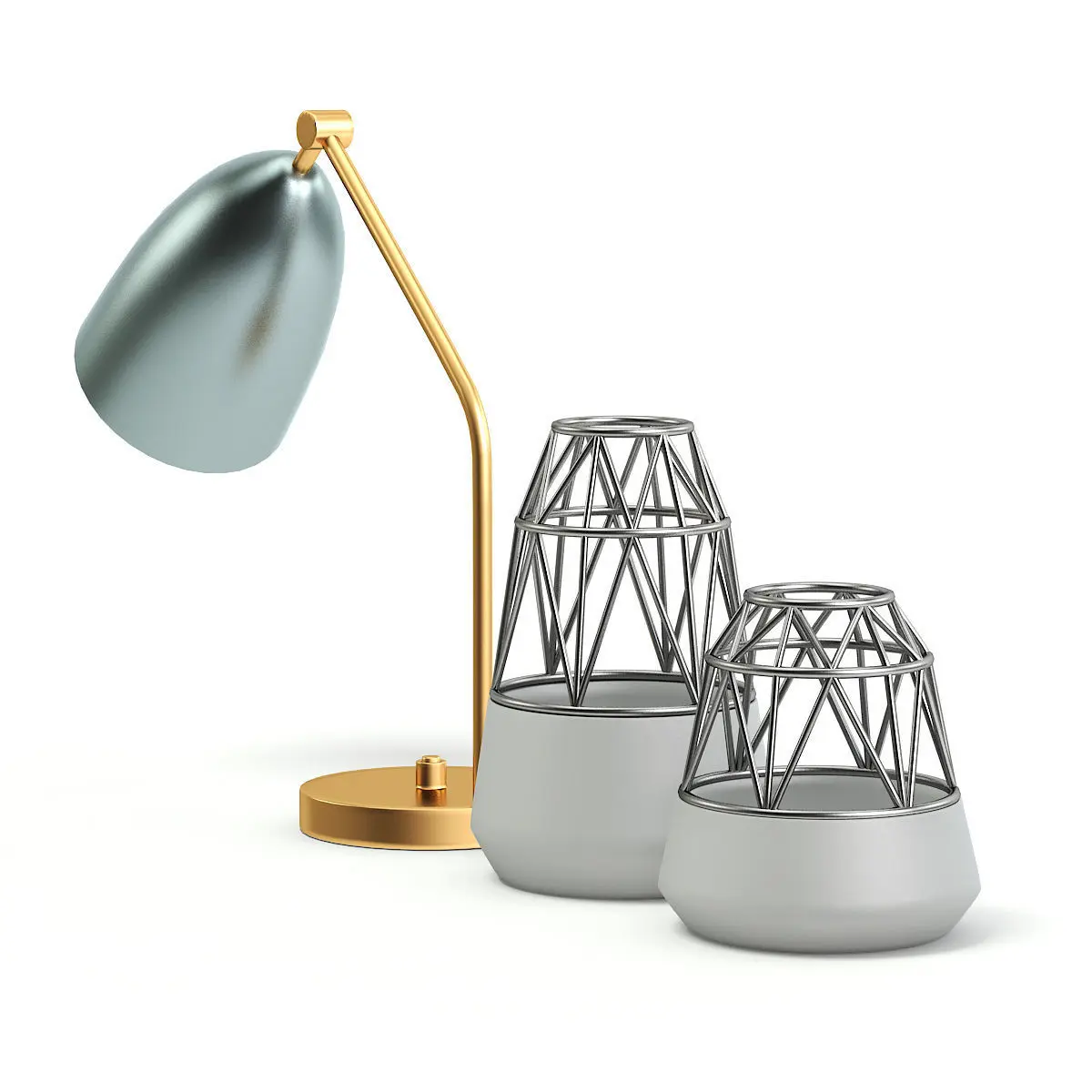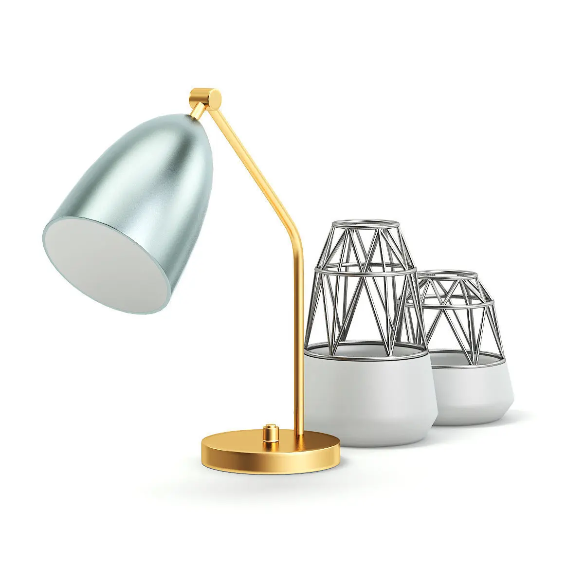 Golden lamp with dark blue shade and decoration vases 3d model. Compatible with 3ds max 2010 (V-Ray, Mental Ray, Corona) or higher, Cinema 4D R15 (V-Ray, Advanced Renderer), FBX, OBJ and Unreal Engine.