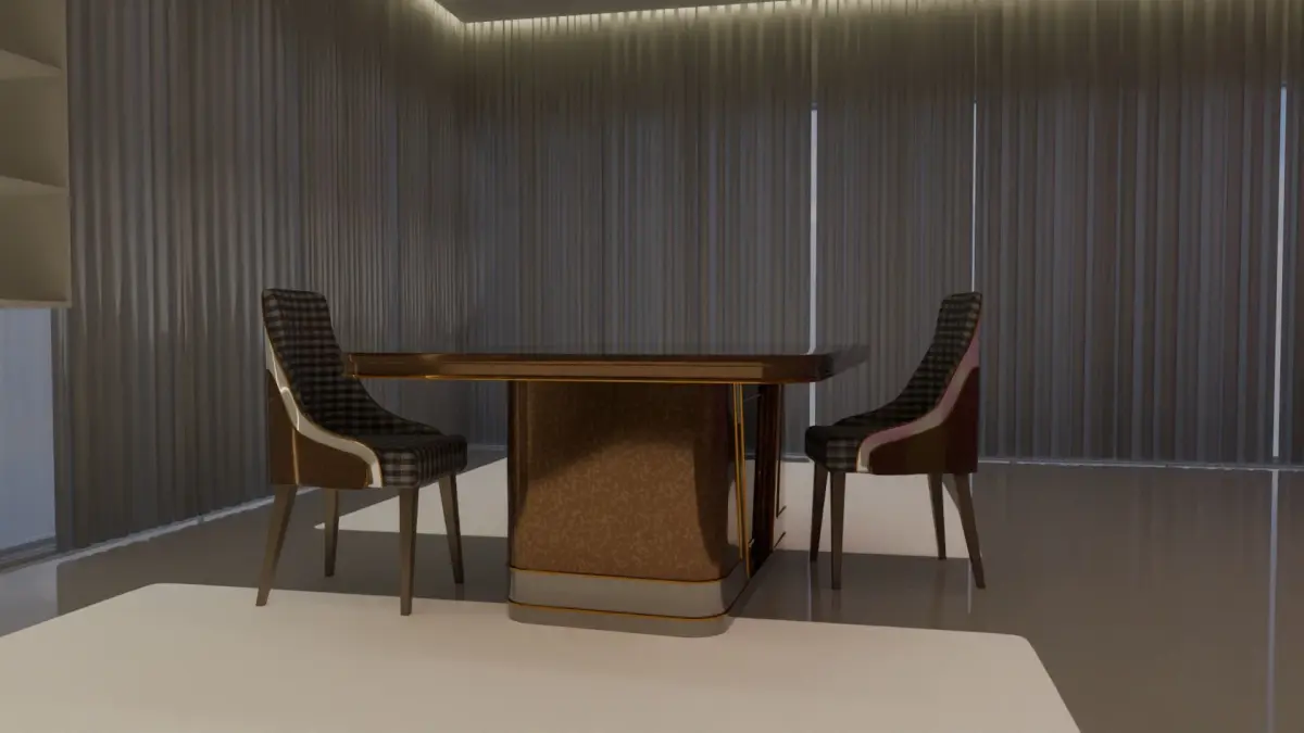 With all textures meticulously included and PBR (Physically Based Rendering) materials seamlessly integrated, every facet of this dining table radiates luxury. The golden color palette imbues an aura of extravagance, effortlessly catching the light and commanding attention in any setting.