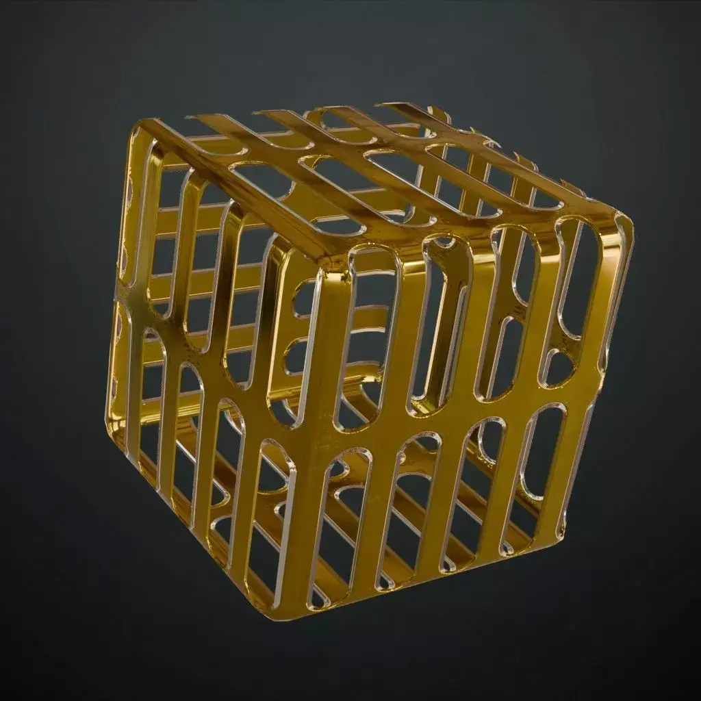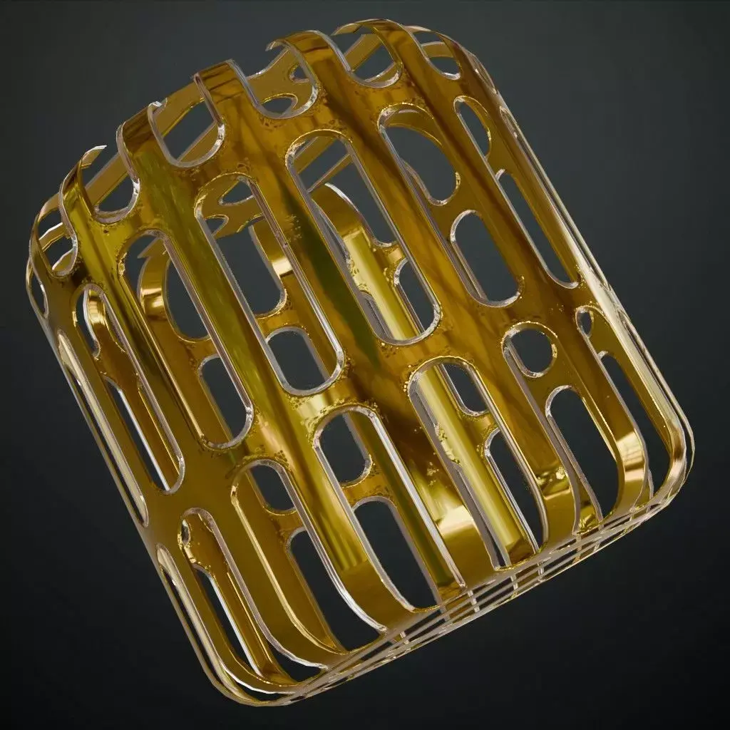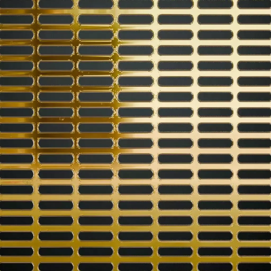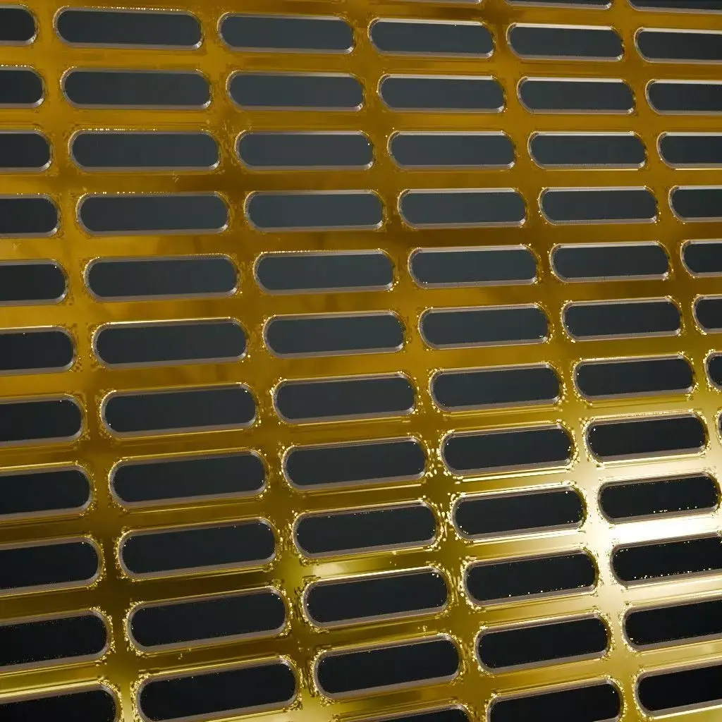 This is a high-quality PBR Texture Pack of a Golden Metal Grill Transparent surface. All essential Maps, including BaseColor, Normal, Roughness, Height, Metallic, and Opacity, are provided to deliver a highly realistic and luxurious industrial finish. This material features a unique pattern of vertical oblong capsule perforations precisely cut into a vibrant, high-gloss golden metallic sheet. The polished surface reflects light with a brilliant shine and is detailed with realistic micro-reflections and a flawless premium finish. This transparent grill is an exceptional choice for modern architectural facades, luxury interior partitions, high-end decorative vents, or stylized futuristic environment assets.