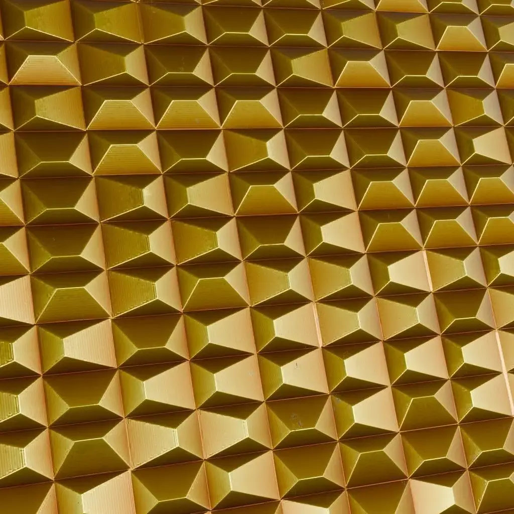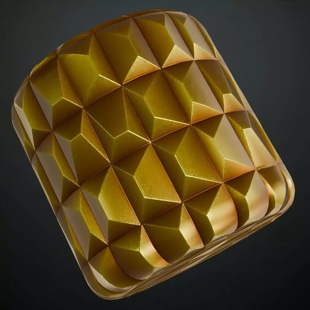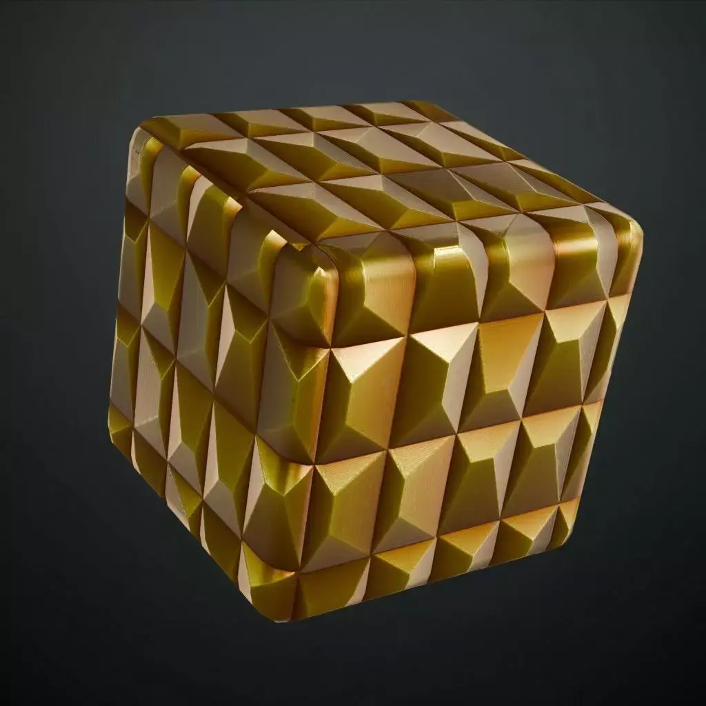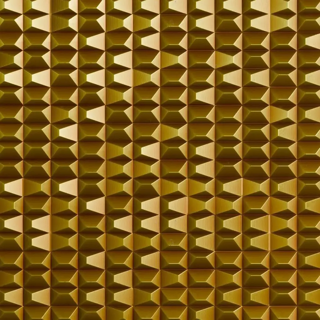 This is a high-quality PBR Texture Pack of a Golden Metal Pattern.All essential Maps, including BaseColor, Normal, Roughness, Height, and Metallic, are provided to deliver a striking and high-end geometric finish. This material features a repeating 3D pattern of raised, faceted rectangular pyramids, creating a diamond-cut or studded aesthetic in a premium golden luster. The sharp angles and metallic surface provide complex light reflections, making it perfect for luxury interior feature walls, upscale retail displays, or decorative sci-fi armor plating.