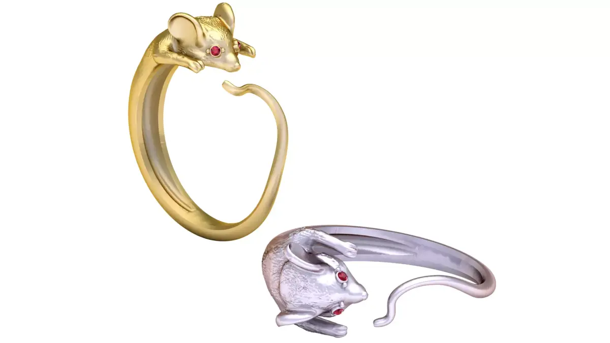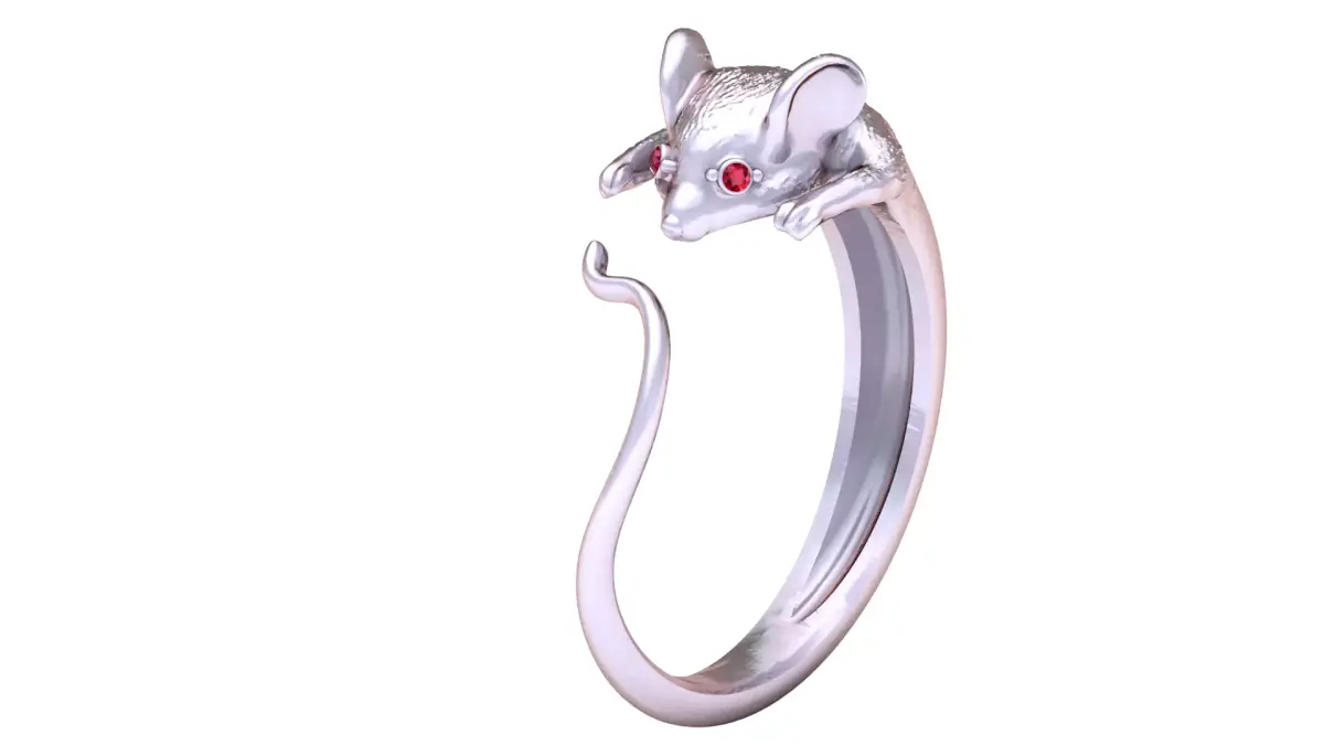 This playful and artistic ring features a finely sculpted mouse design in polished gold, wrapped gracefully around the finger. The mouse’s lifelike details, from its ears to its tiny paws, bring charm and character to the piece. Its eyes sparkle with brilliant ruby-red gemstones, adding a touch of luxury and striking contrast. The tail elegantly curves to complete the open-band design, making this ring both whimsical and stylish.