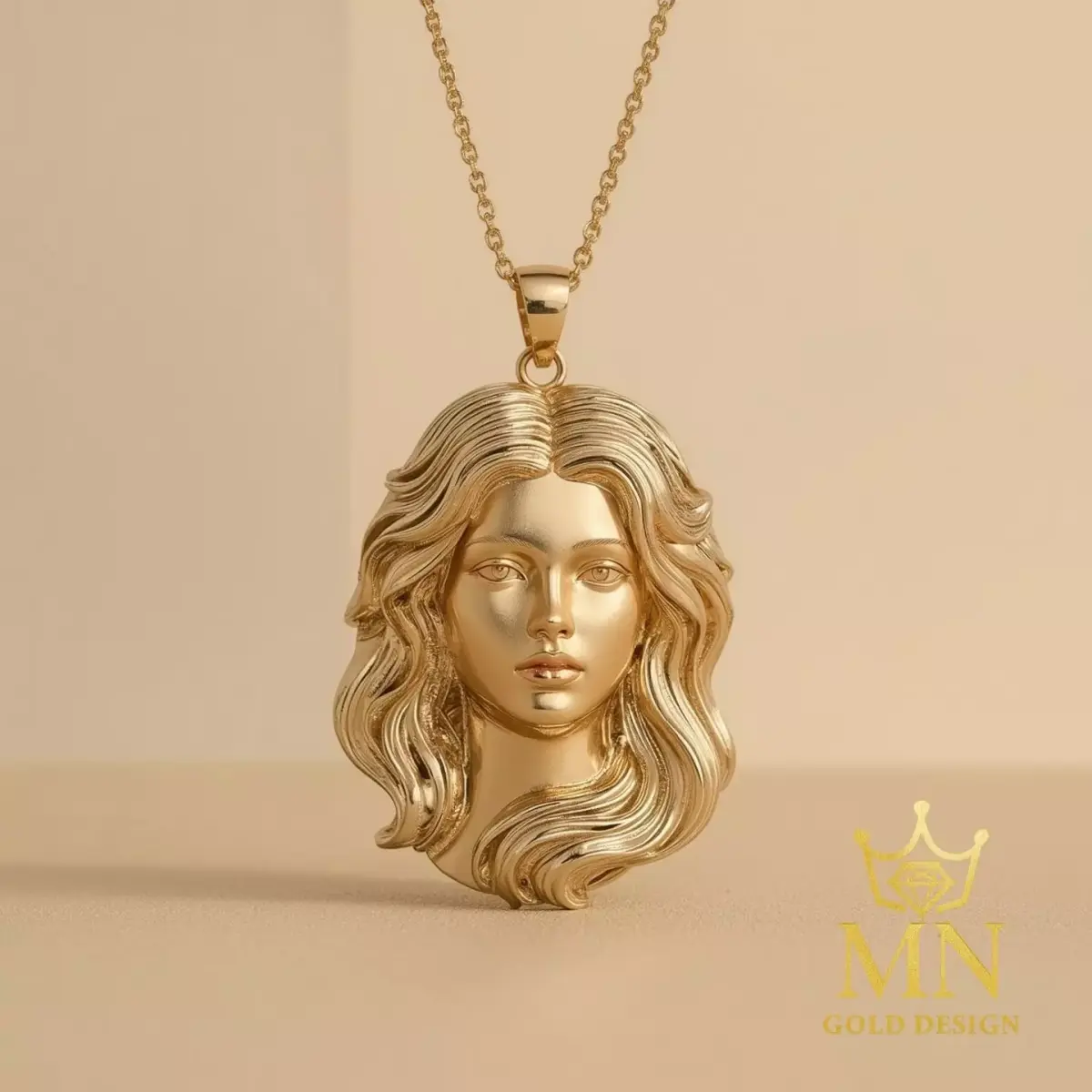 Bring timeless beauty and art to life with the Golden Muse, a stunningly detailed 3D pendant design portraying a graceful female face with flowing hair. This high-quality model captures every delicate contour — from the soft expression to the realistic hair texture — making it perfect for fine jewelry casting in gold, silver, or other precious metals.